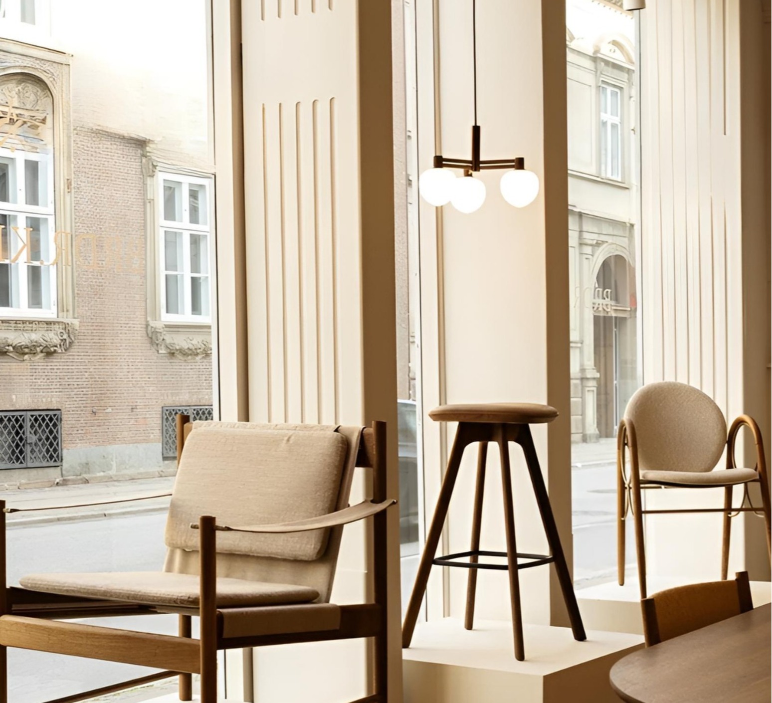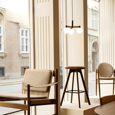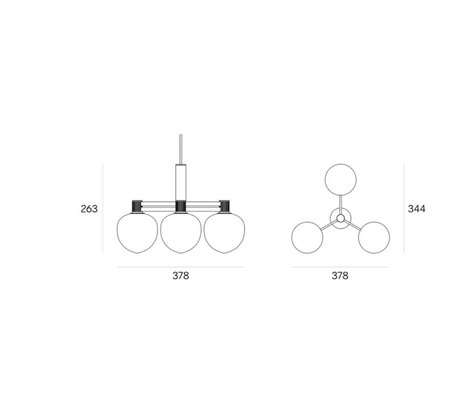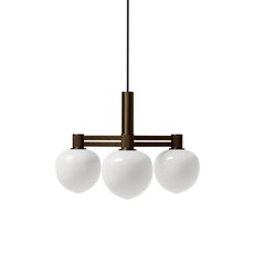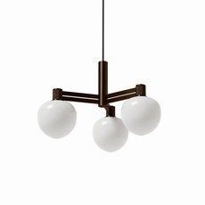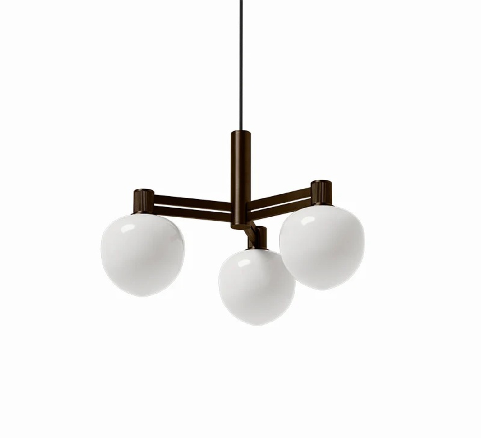 Diseñada en 2023, esta luminaria retoma el espíritu de la lámpara de araña clásica dándole una interpretación contemporánea. Con los tres difusores opalinos que caracterizan la serie, se inscribe en un enfoque escandinavo que combina funcionalidad y pureza formal.