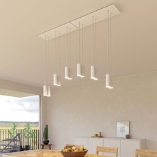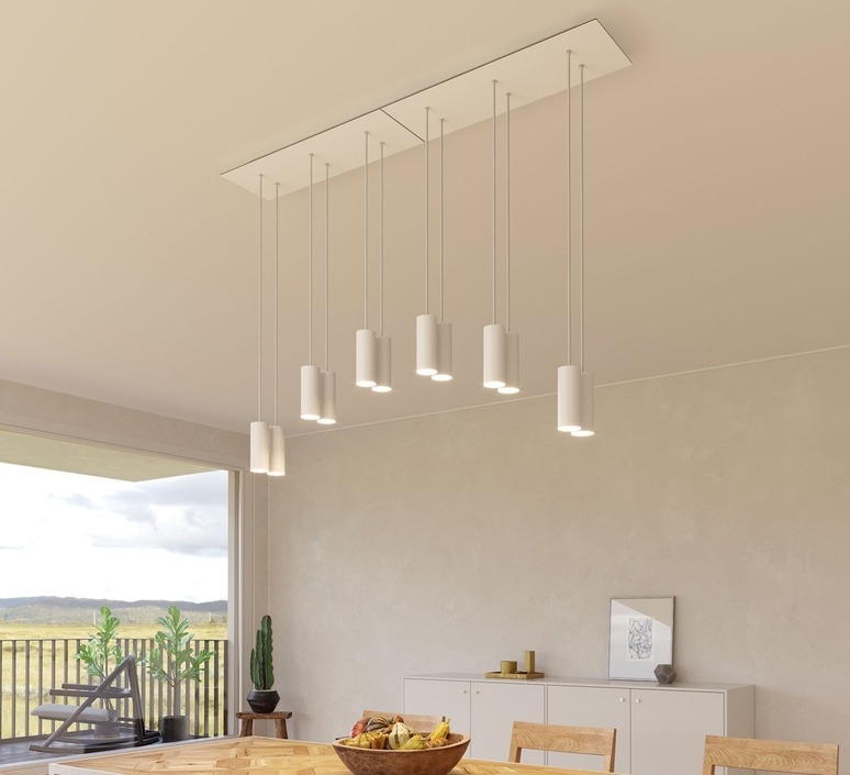 Compuesta por seis suspensiones tubulares de metal blanco mate, esta lámpara destaca por su silueta gráfica y sus líneas armoniosas. El dosel rectangular Rose-One, con un acabado de gran calidad, aporta estructura visual al espacio y garantiza un efecto luminoso uniforme. Perfecto sobre una gran mesa, una isla de cocina o en una zona de recepción, difunde una luz directa y dirigida al tiempo que añade un toque de elegancia arquitectónica. Para un efecto espectacular, se pueden colocar dos lámparas Tub-E14 una al lado de la otra para crear una composición de 12 luces (como en nuestra foto de ambiente), ideal para grandes espacios o proyectos de interiorismo de alta gama.