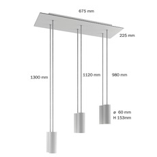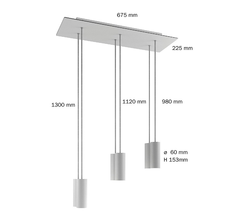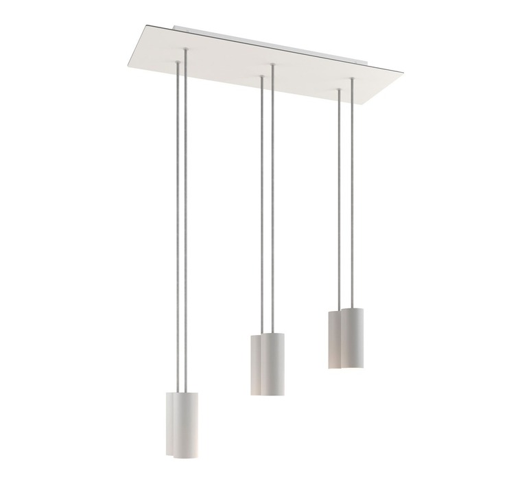 Esta luminaria incluye un dosel rectangular Rose-One (67,5 x 22,5 cm), seis portalámparas E14 (máx. 10 W cada uno) y cables textiles blanco óptico brillante de 1,30 m, 1,12 m y 0,98 m para un efecto visual rítmico. Compatible con LED PAR16, R50 Satin o cualquier bombilla E14 Ø < 50 mm (no incluida), proporciona una iluminación directa que puede regularse en función de la instalación y la bombilla elegidas. Incluye el rosetón Rose-One para montaje en superficie, y su sistema modular permite unir varias luminarias para crear composiciones lumínicas únicas.