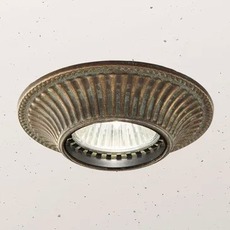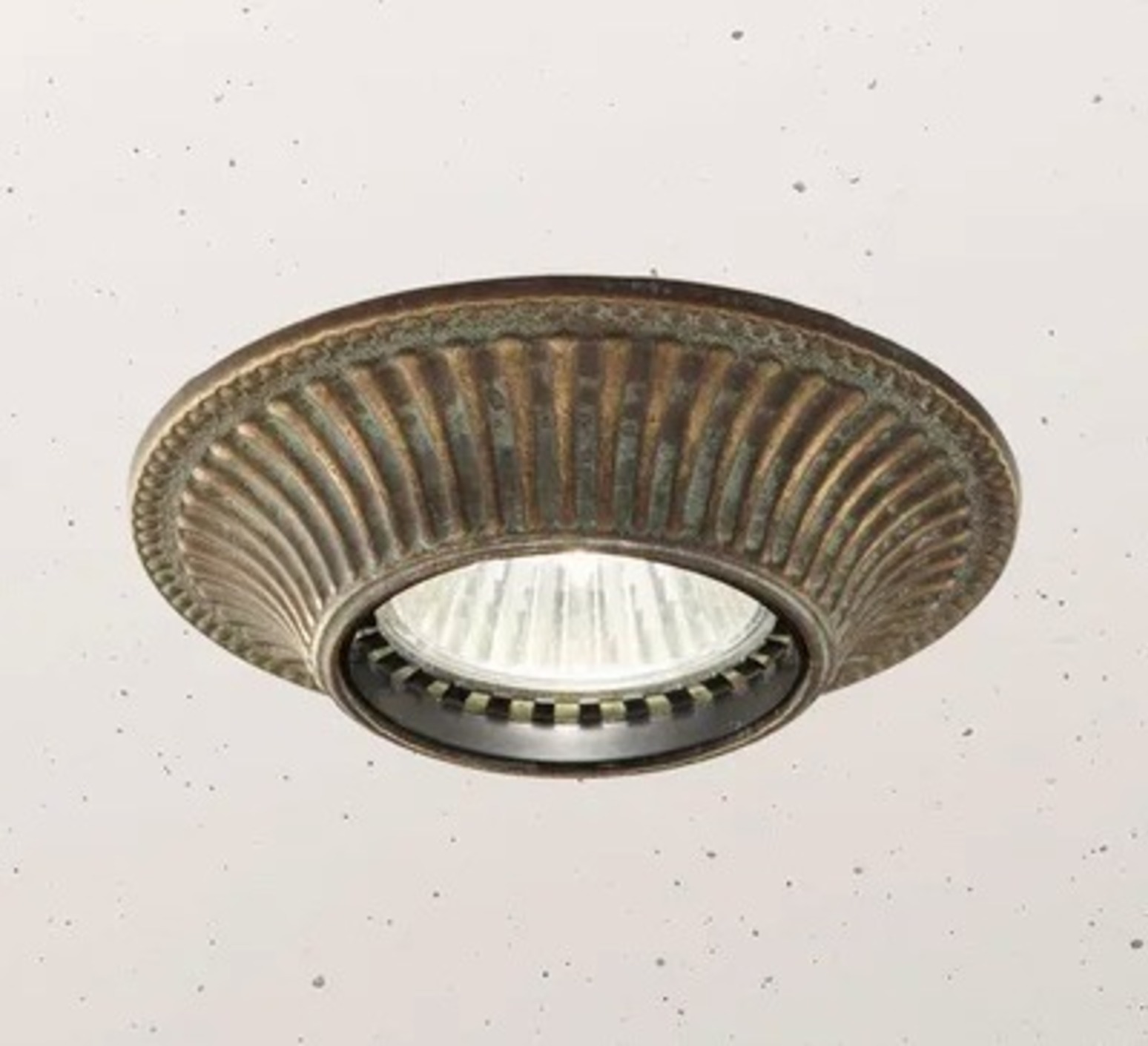 Su acabado en latón envejecido confiere a este foco una presencia cálida y elegante que realza los volúmenes del techo sin sobrecargar la vista, al tiempo que evoca la maestría italiana en el trabajo del metal.