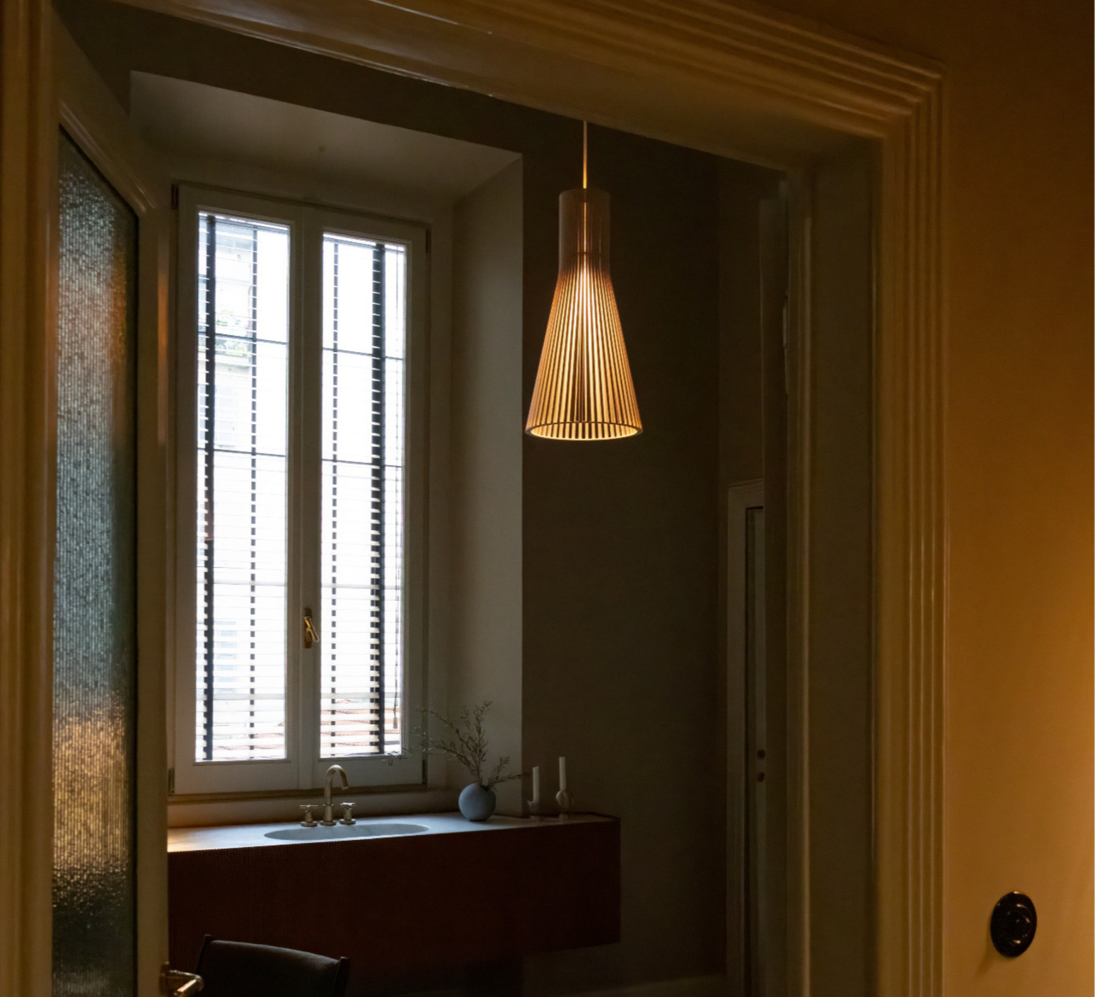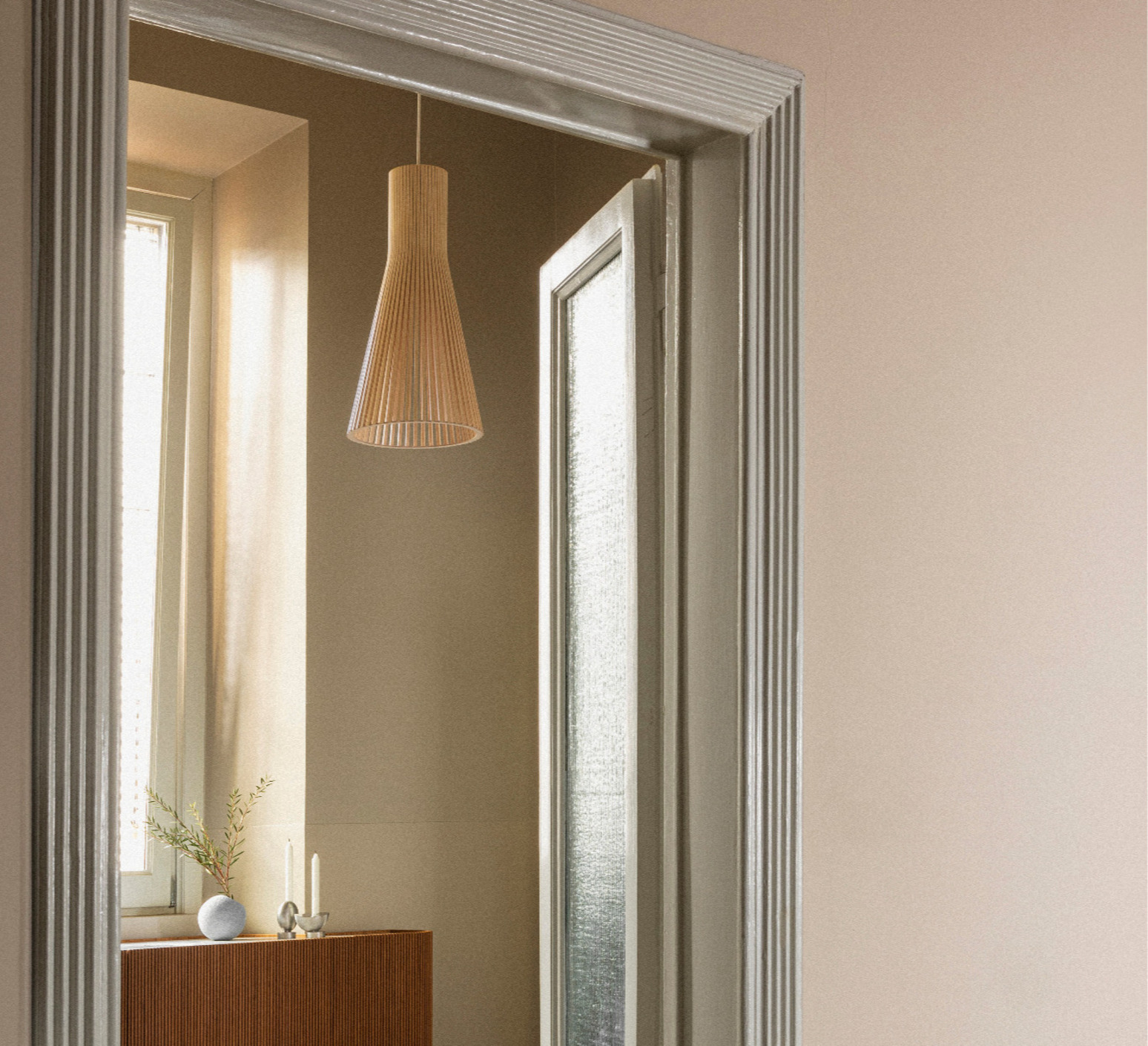 Esta emblemática colección está disponible en varios modelos (suspensión, aplique, sobremesa y lámpara de pie) que podrá combinar para crear un conjunto armonioso y refinado. La cara interior de las lamas es siempre de abedul natural.