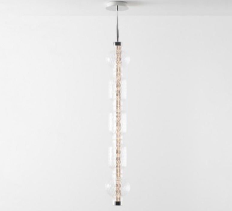 Diseñada como luminaria modular, combina un núcleo de aluminio extruido que incorpora circuitos LED en sus cuatro caras, con diferentes capas de vidrio que juegan con la transparencia y la textura. El primer cilindro, de vidrio moleteado, difunde una luz suave y sin deslumbramientos, al tiempo que deja al descubierto la estructura interior. A su alrededor, difusores de formas fluidas y transparentes, trabajados con la técnica tradicional del ballotón, realzan la luz y confieren a Alambicco su carácter poético y refinado.
