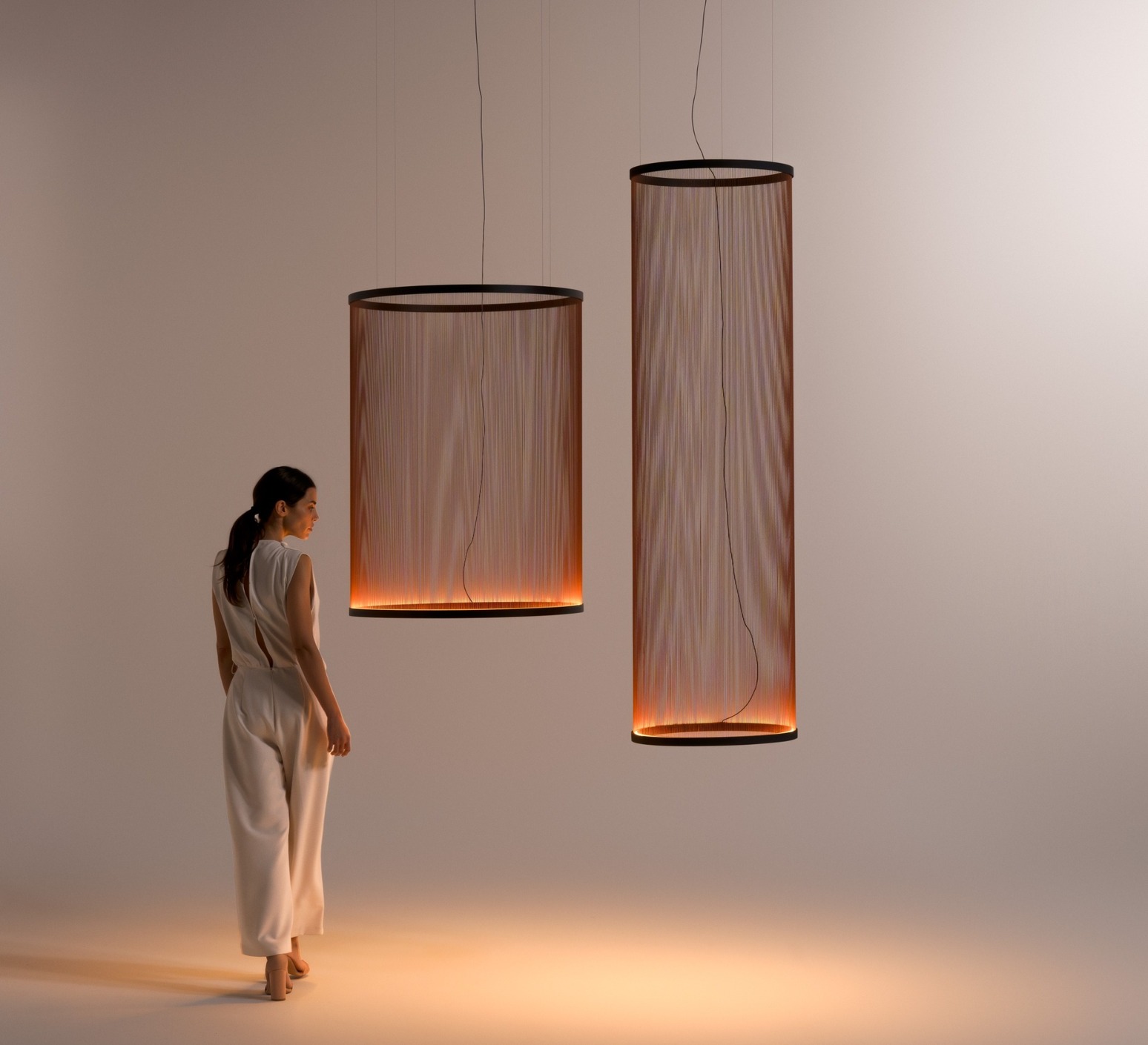 Estéticamente, la luminaria Array adopta la forma de un imponente cilindro de 55 cm de diámetro y 193 cm de altura. La combinación de aluminio y latón confiere a la luminaria una estética refinada, que añade un toque de sofisticación a cualquier interior. Array no es sólo una luminaria, sino una obra de arte suspendida que crea una atmósfera visual cautivadora gracias a una pantalla tejida con hilos de terracota. Instalada sobre una mesa de comedor o en una zona de recepción, esta araña impresiona por su imponente presencia y su luz difusa de 360 grados.
