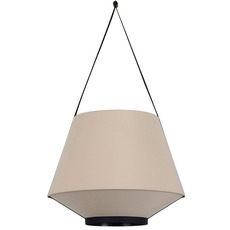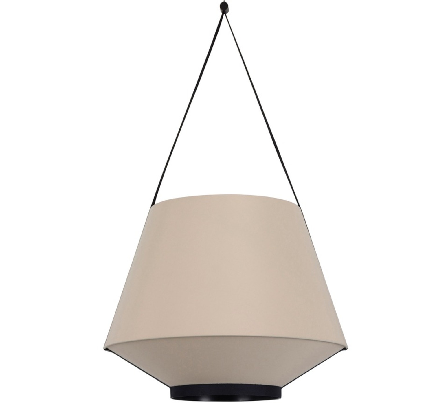 La suspensión adopta la forma de una pantalla en formato lumignon, provista de una correa para colgarla del rosetón del techo. La pantalla de tela deja filtrar una luz suave. Esta disposición recuerda la delicadeza de los farolillos chinos.