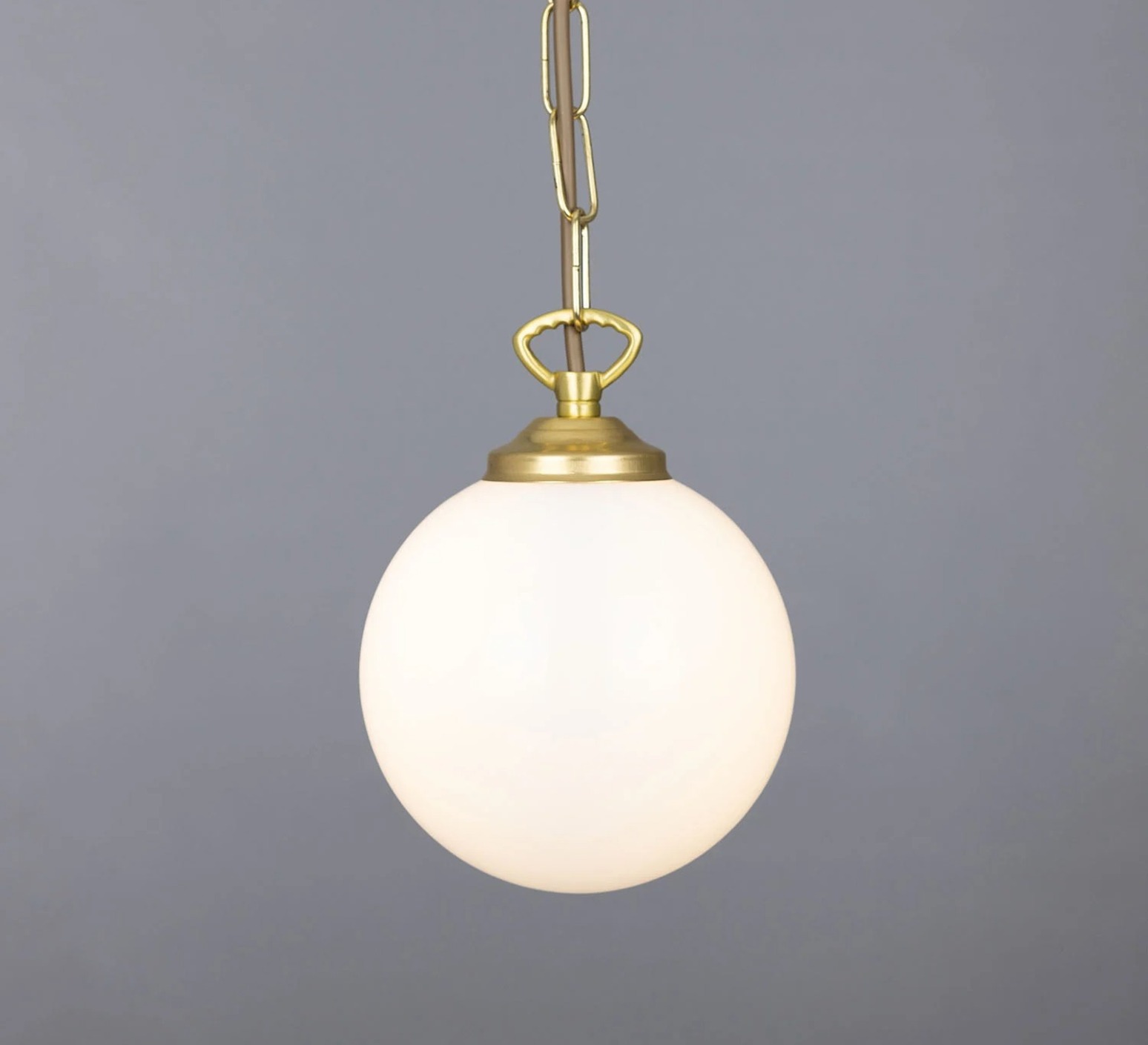 El colgante consta de un globo de cristal opalino de Ø 14 cm suspendido por una cadena ajustable y una copa de metal disponible en acabados como latón envejecido, plata envejecida o latón pulido. Funciona con una bombilla G9 de 6,5 W de potencia máxima (no suministrada, pero disponible como accesorio indispensable).