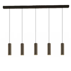 De diseño sofisticado y elegante, esta lámpara de araña de aluminio cepillado de color bronce está fabricada en Bélgica. Se compone de cinco lámparas de suspensión hexagonales de 30 cm de altura cada una y de un plafón negro (longitud: 150 cm; anchura: 3 cm; altura: 4,5 cm) con cinco salidas. La lámpara HEXO MULTI difunde una luz suave e íntima, creando un ambiente cálido; ideal en una cocina o un comedor.