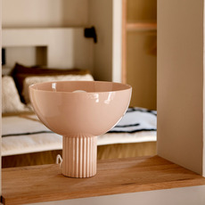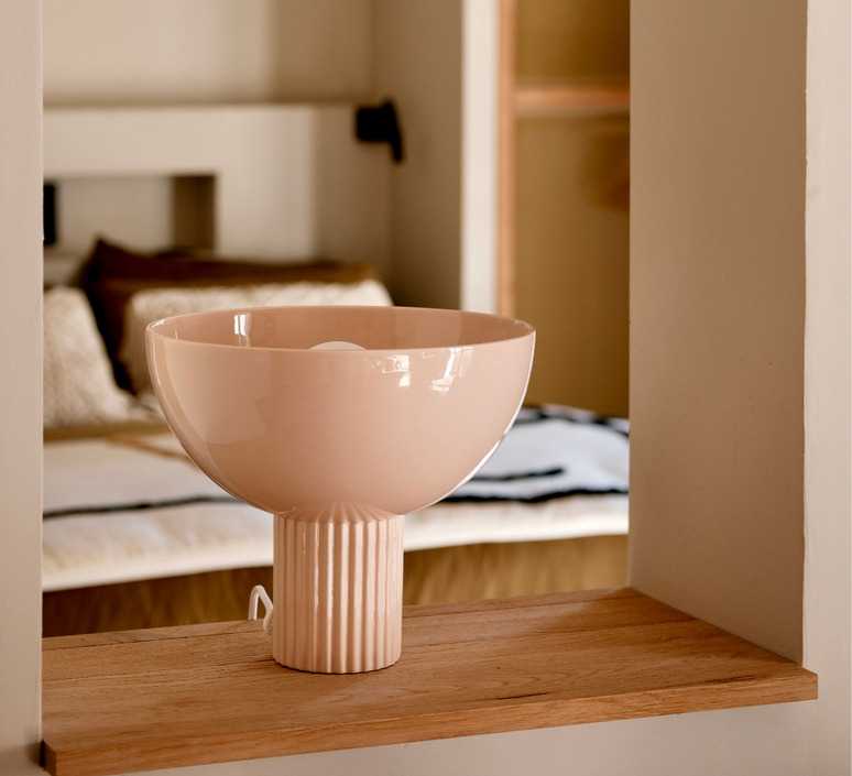 Fabricada en cerámica pulverizada con acabado brillante, esta lámpara circular capta la luz jugando con sus reflejos. Su silueta baja quedará estupenda en una mesa auxiliar, una consola o una mesilla de noche. Su color cálido y esmaltado aporta calidez visual a los espacios de tonos neutros o minerales.