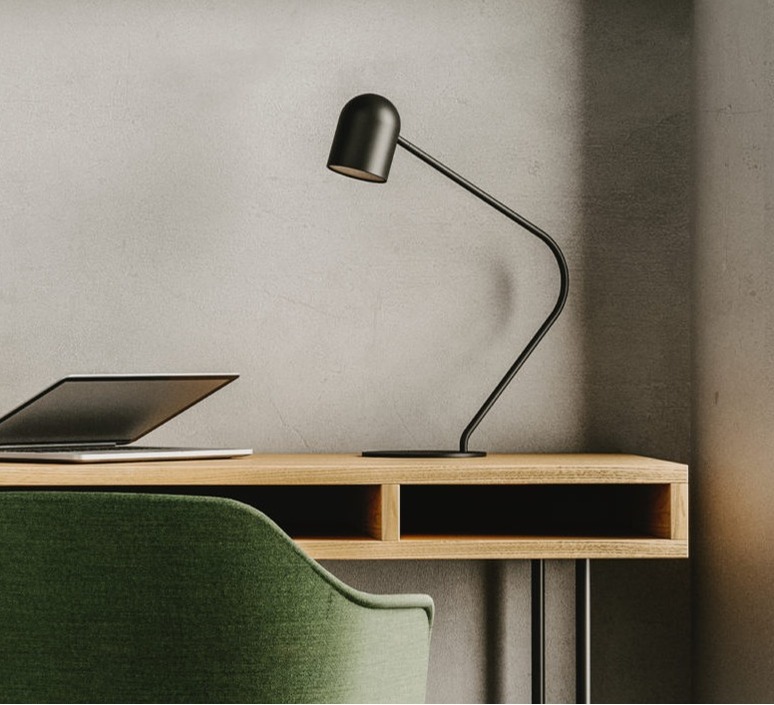 La lámpara de sobremesa Pipe, diseñada por AC Studio para Aromas del Campo, cautiva por su silueta cilíndrica minimalista en acero negro mate.