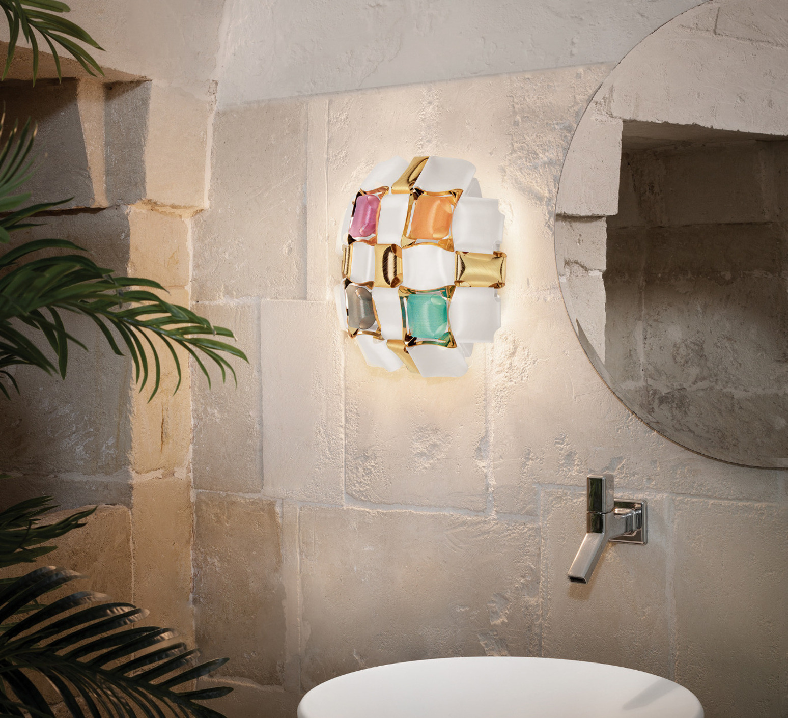Disponible en blanco y dorado, Mida difunde una suave luz de 360°, iluminando sutilmente su interior. Los cabujones pulidos, dispuestos geométricamente en una corola floral, recuerdan el brillo de las piedras preciosas de colores y metálicas. Cada pieza está hecha a mano, y el sistema magnético integrado facilita su instalación y mantenimiento, ofreciendo un montaje sencillo y ajustable en la pared.