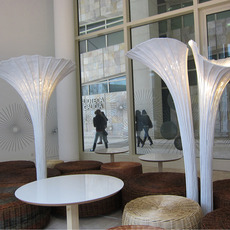 Esta luminaria de pie tiene un estilo gráfico con una forma orgánica, diseñada como una pieza decorativa fuerte para espacios interiores contemporáneos.