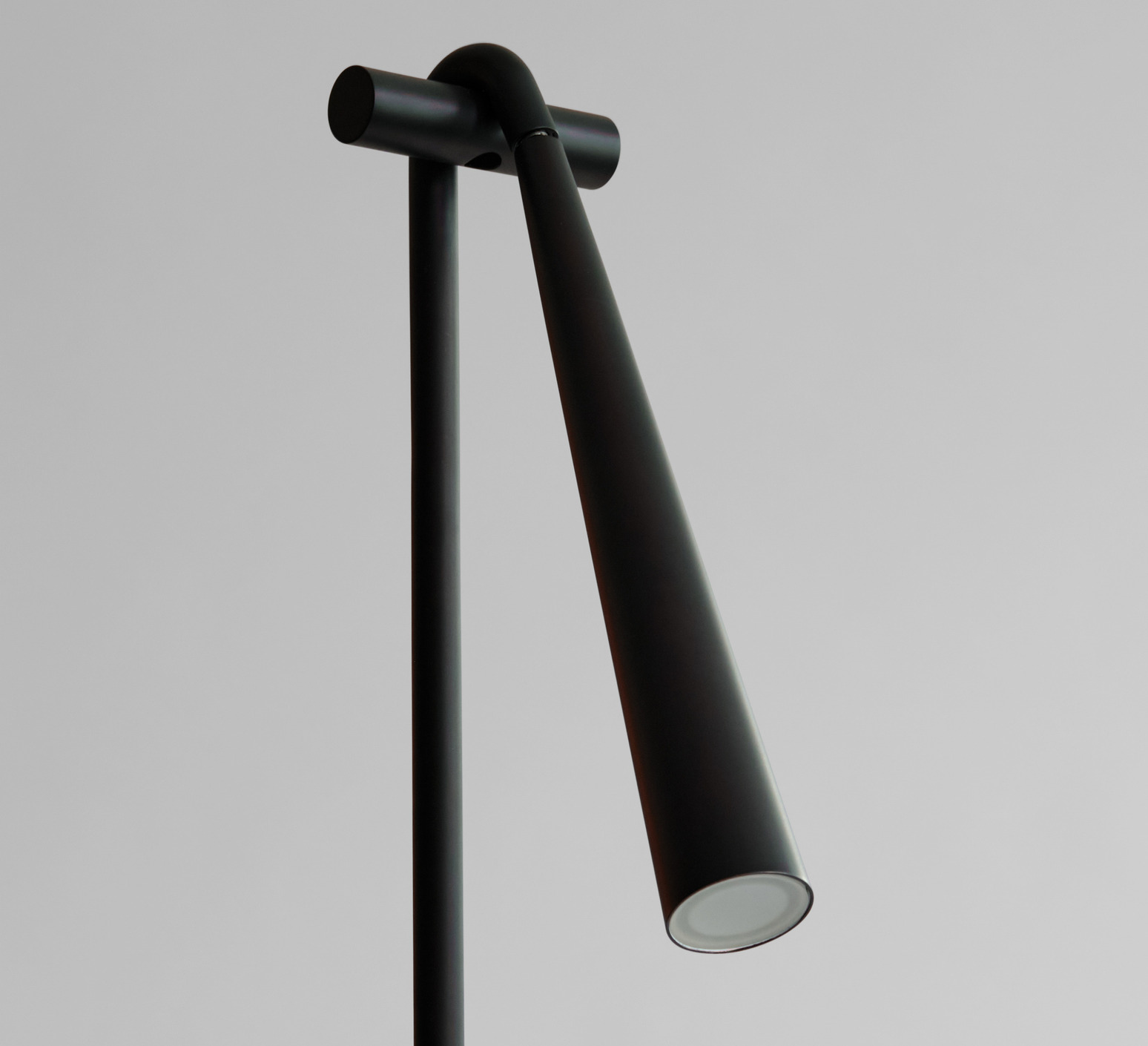 Su estructura de aluminio negro quemado se despliega en esbeltos tubos que desembocan en una pantalla cónica giratoria que difunde una luz cálida y directa. La lámpara de pie Snake puede colocarse junto a un sillón o en la esquina de una habitación para crear un punto de luz dinámico, o combinarse con otros modelos para estructurar el espacio y dar ritmo a la iluminación en un interior contemporáneo.