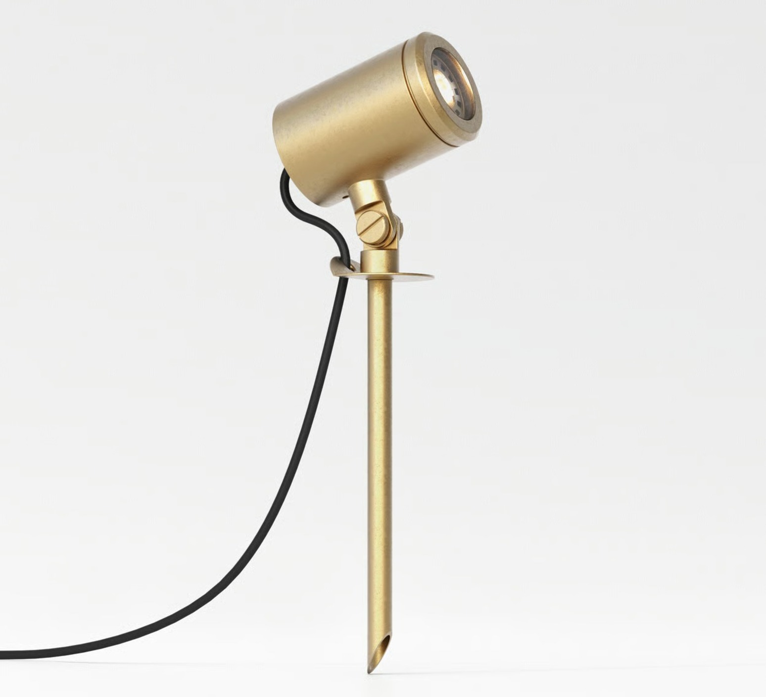 Su cuerpo de latón macizo le confiere una elegancia atemporal al tiempo que ofrece una robustez excepcional frente a los elementos, y su diseño cilíndrico complementa los esquemas paisajísticos modernos y tradicionales. Este foco de poste es una linterna contemporánea y funcional, diseñada para resaltar con precisión los volúmenes del jardín o los elementos arquitectónicos.