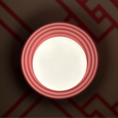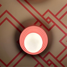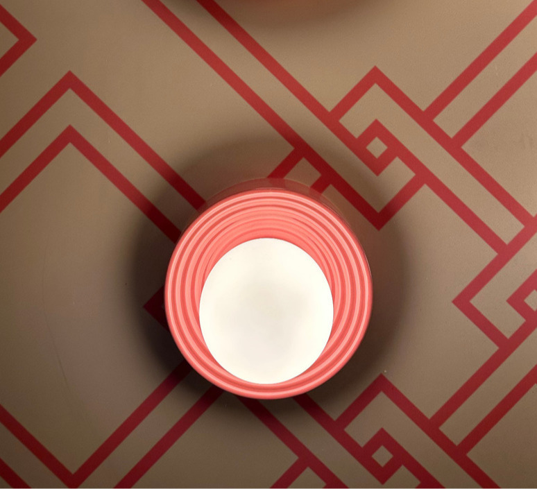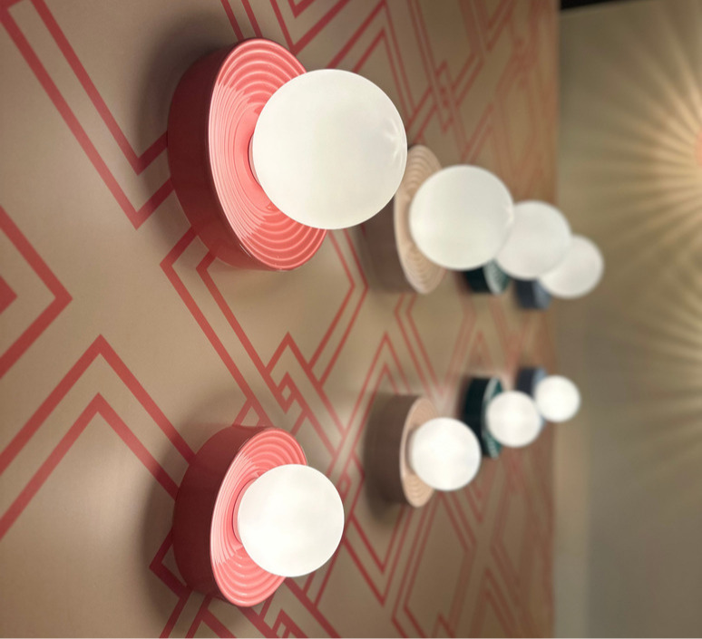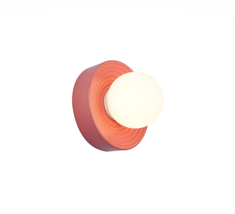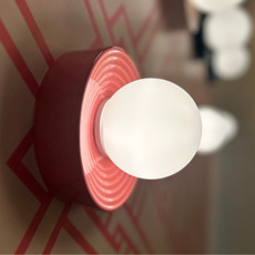 La finition rose apporte une touche de peps qui vient subtilement contraster avec la douceur du globe en verre opale. Sa forme circulaire et texturée, marquée de sillons rappelant les disques vinyles, évoque un style Memphis affirmé.