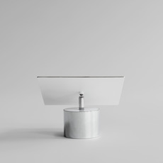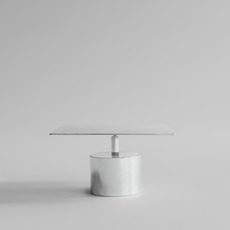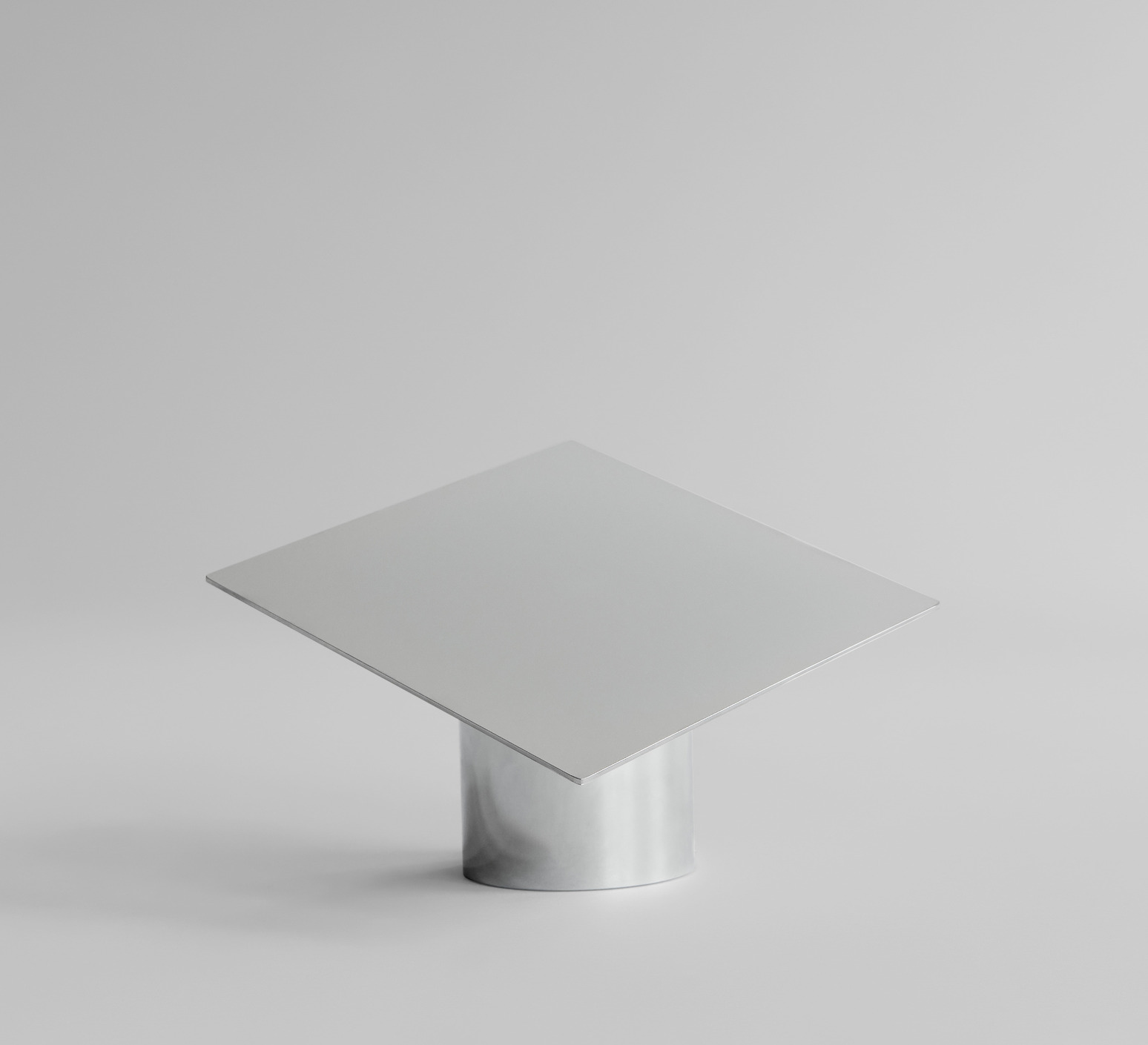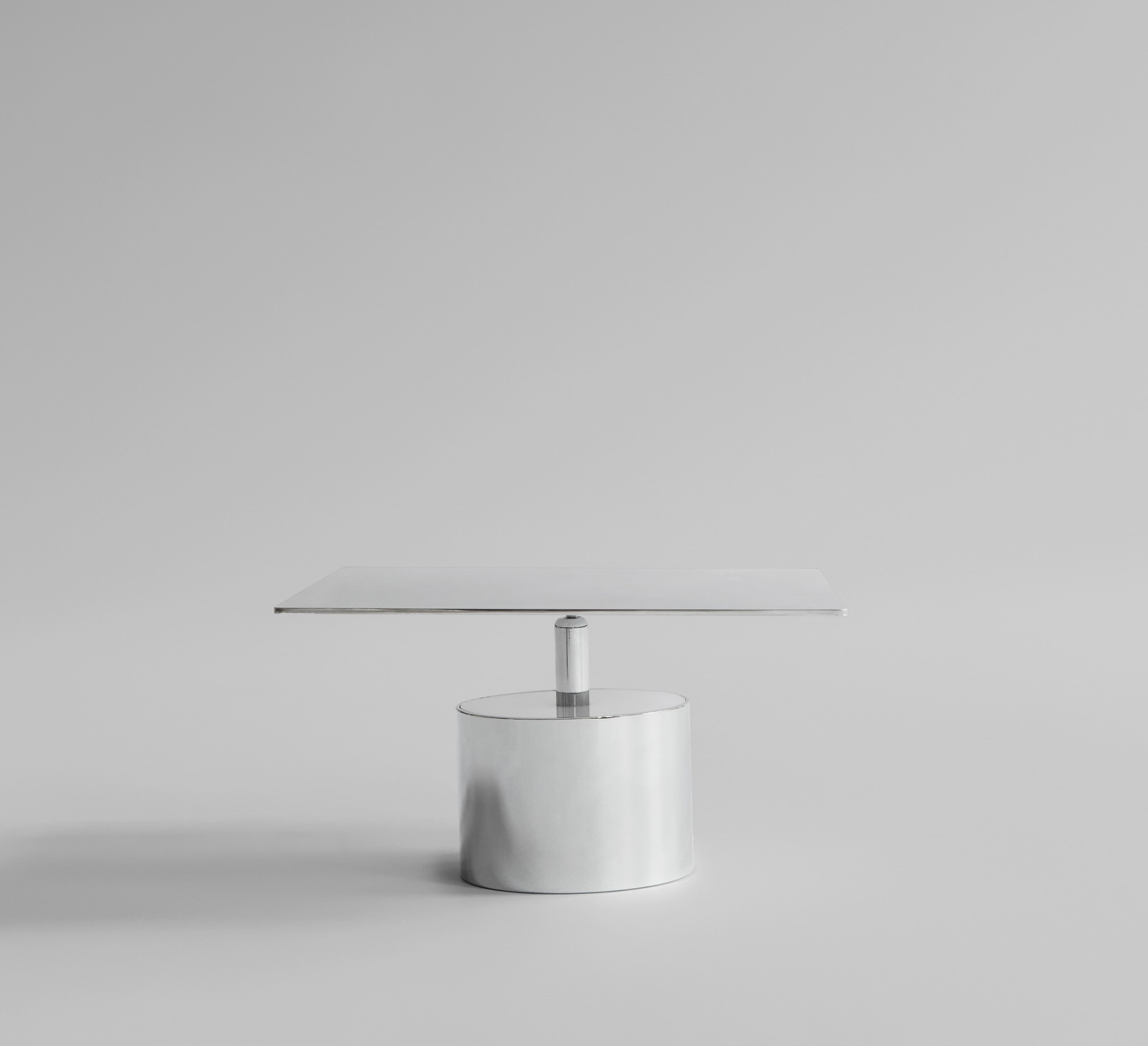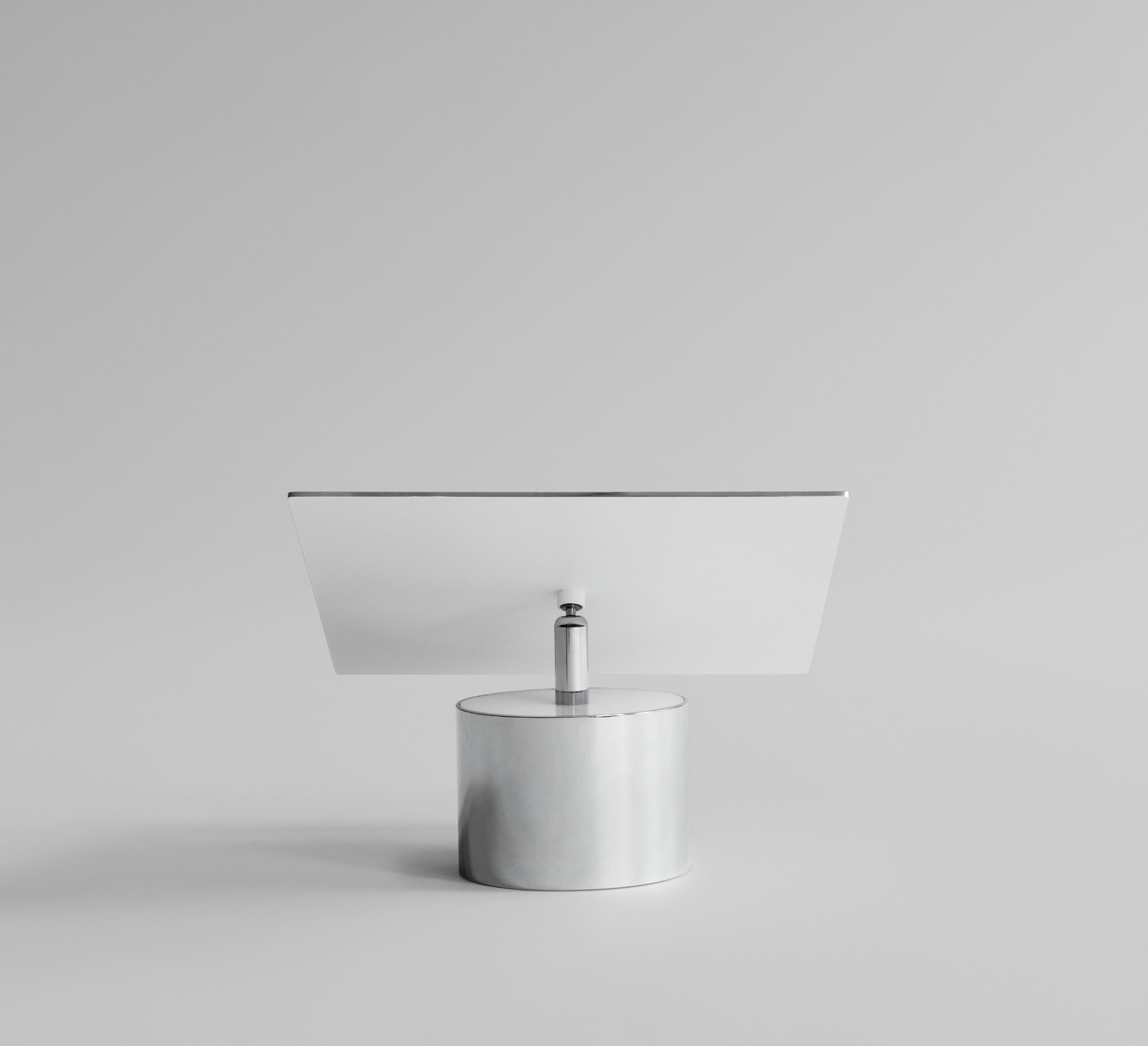 Inspirée du minimalisme graphique des années 1980, elle se distingue par des lignes nettes et une géométrie cubique précise. Sa finition chrome reflète la lumière et l’environnement, renforçant l’effet sculptural du volume en aluminium.