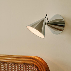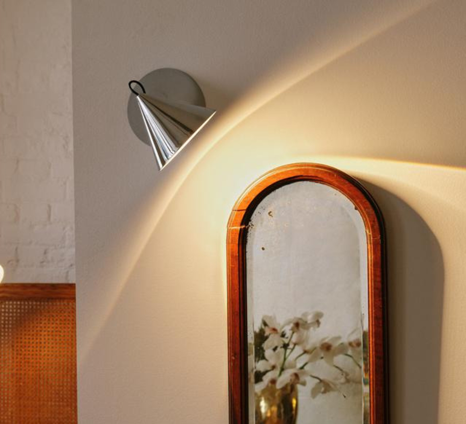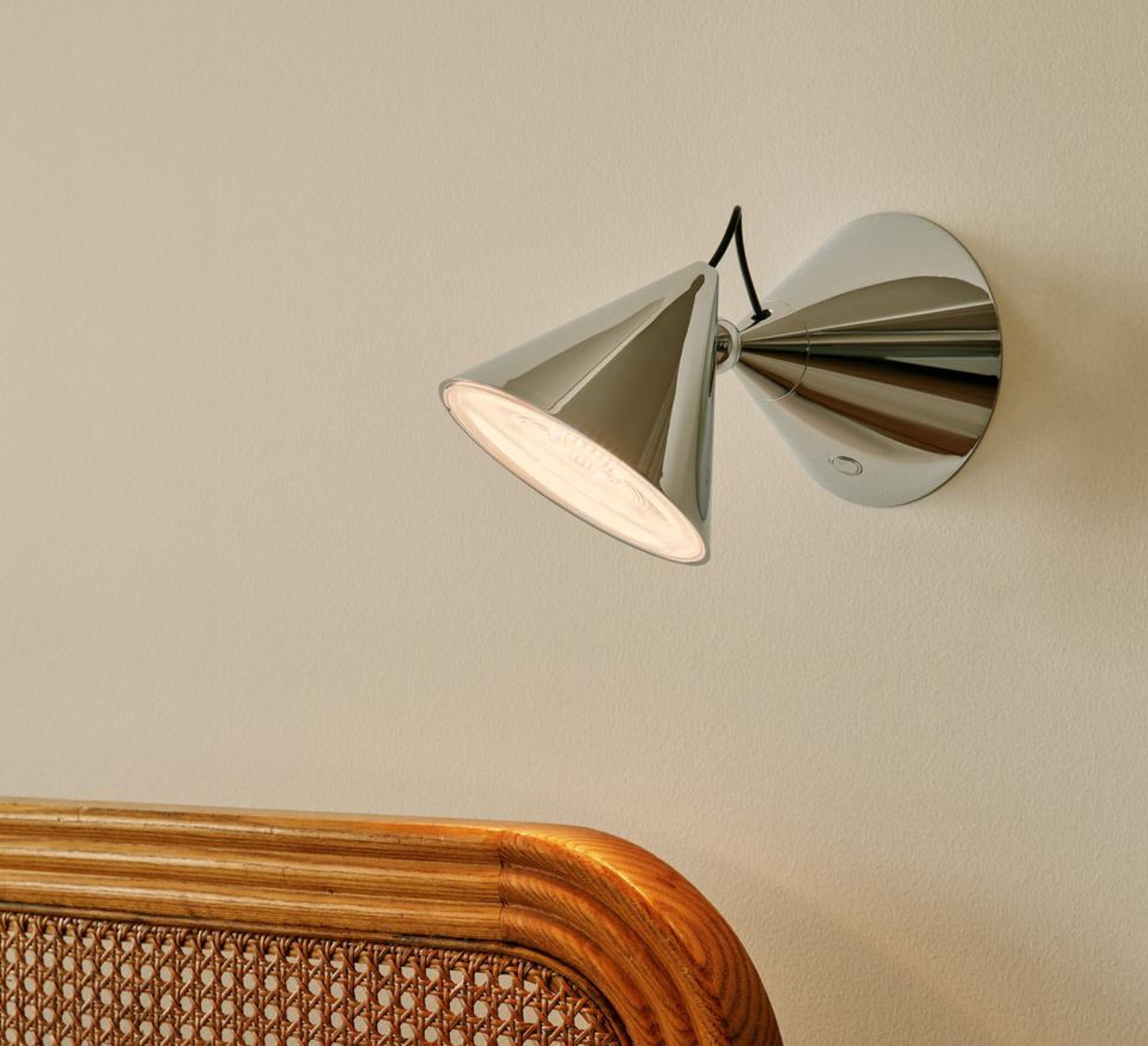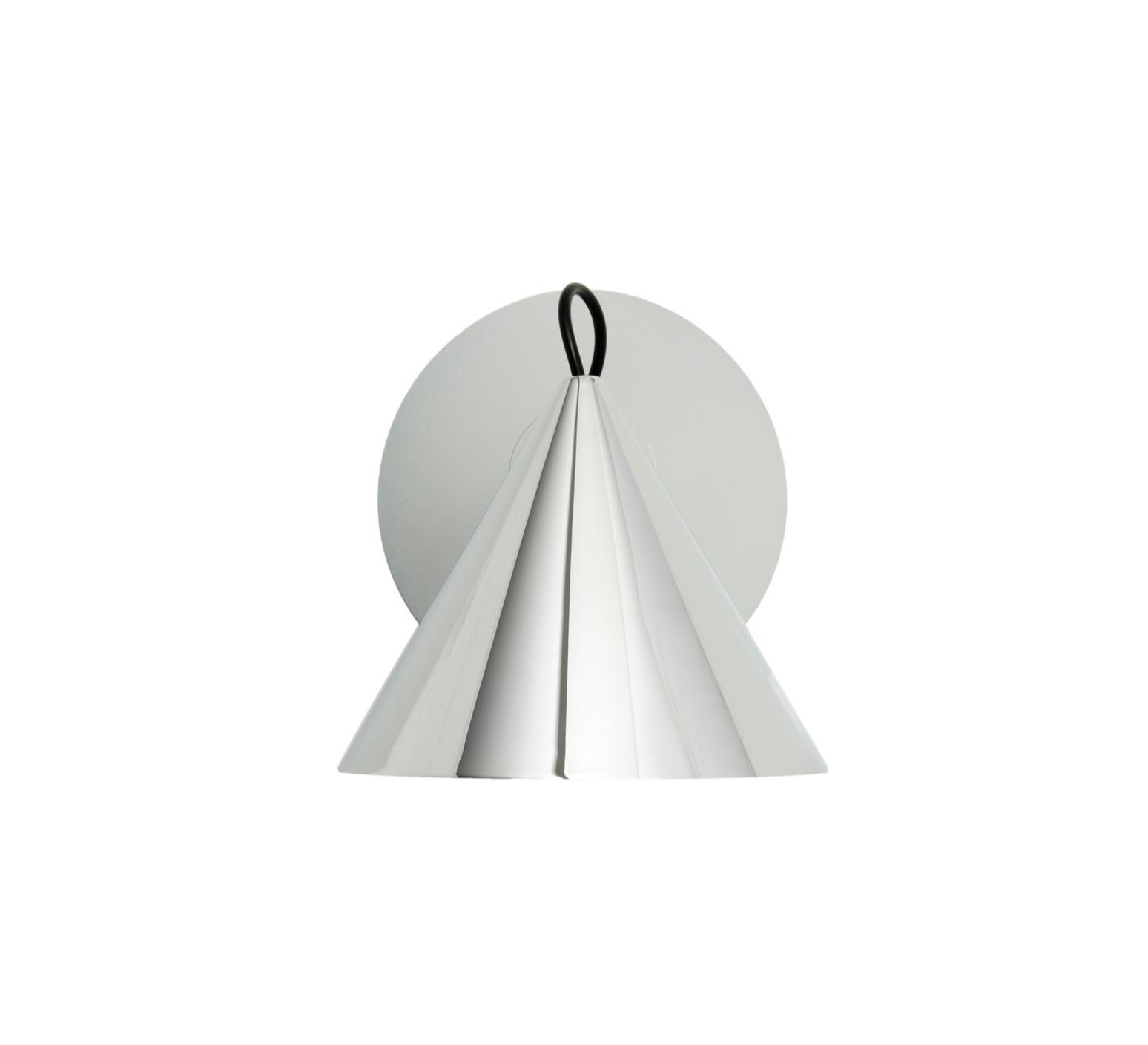 Sa silhouette conique affirmée, associée à la teinte argent, compose un objet mural au caractère graphique marqué. Inspirée des lentilles plates utilisées dans les phares et instruments scientifiques, l’applique crée un faisceau précis qui structure le mur et met en valeur un volume, un passage ou une zone fonctionnelle. Elle trouve naturellement sa place dans un salon, un couloir ou un espace professionnel, seule ou en composition rythmée.