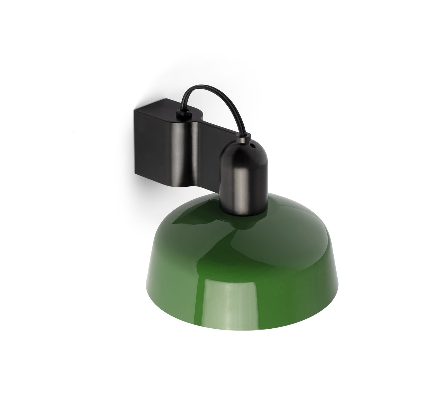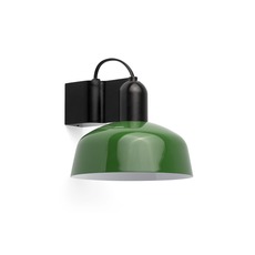 A la fois compacte et élégante, l'applique murale présente un corps en aluminium et un abat-jour en verre opalin vert. Elle offre un éclairage direct et un confort visuel adapté à côté d'une tête de lit.