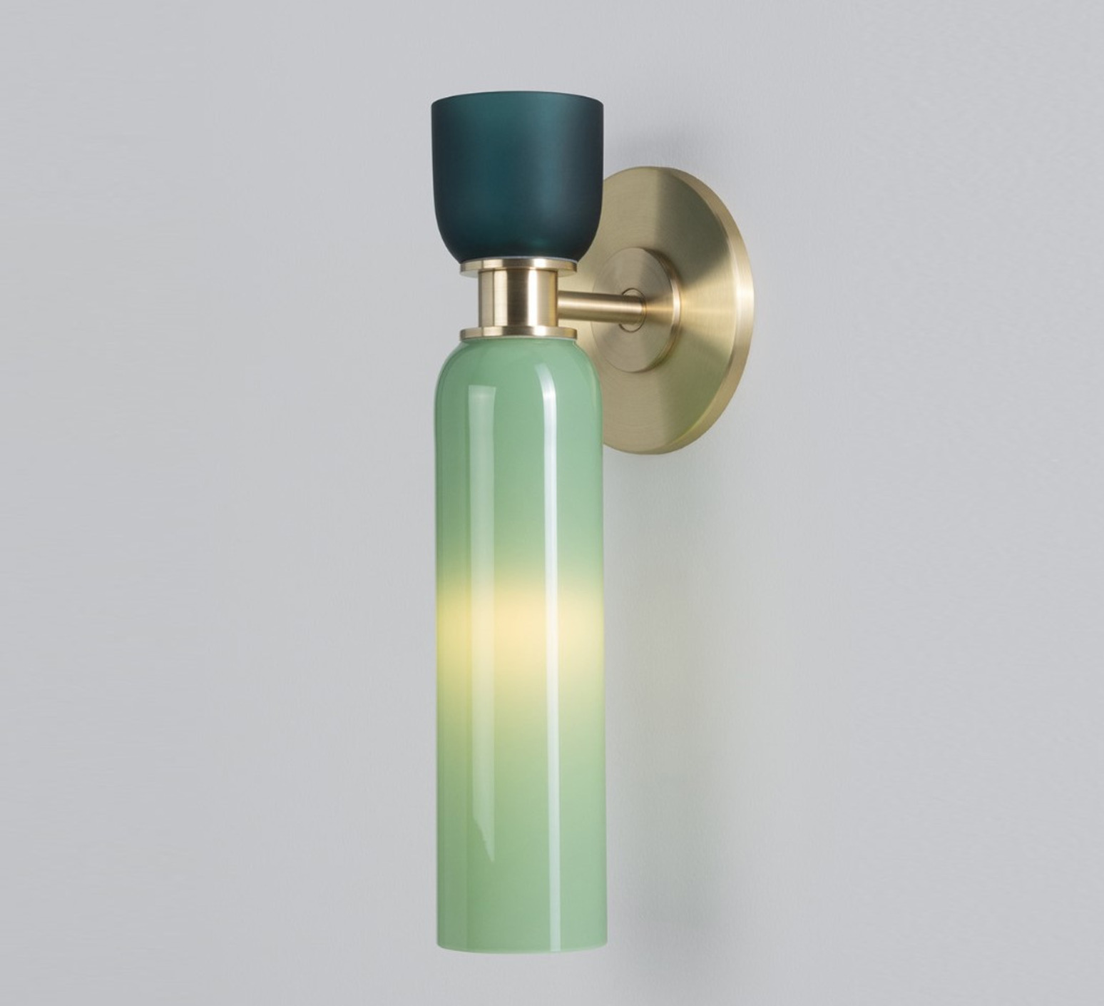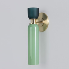 Son design cylindrique associe deux dômes de verre soufflé aux proportions contrastées : un dôme inférieur allongé en verre opaque vert pastel et un dôme supérieur plus compact en verre vert sapin givré. Séparés par un élément central en laiton aux détails classiques, ces volumes créent un jeu subtil de textures et de transparence. L'applique Union s'intègre avec élégance dans un salon, un couloir ou une chambre, seule ou en composition murale.