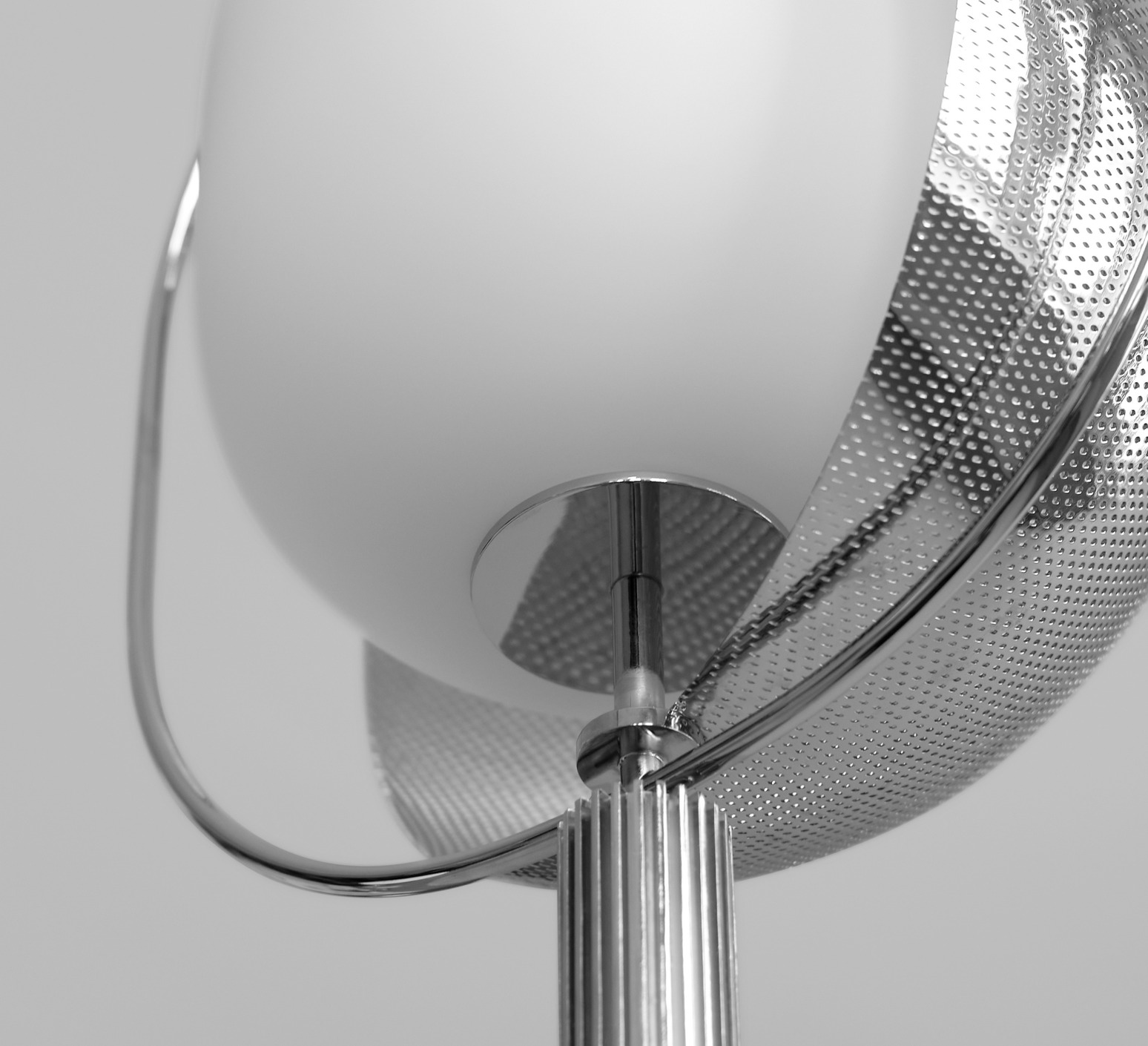 Son design sphérique combine une structure en aluminium chrome à un abat-jour en verre opale partiellement entouré d’un écran perforé, qui projette des motifs d’ombre et de lumière modulables. L’écran rotatif permet d’ajuster l’ambiance selon les besoins. Pearl s’installe dans un coin de salon ou à côté d’un fauteuil, apportant une présence lumineuse qui rythme et enrichit l’espace tout en restant discrète.