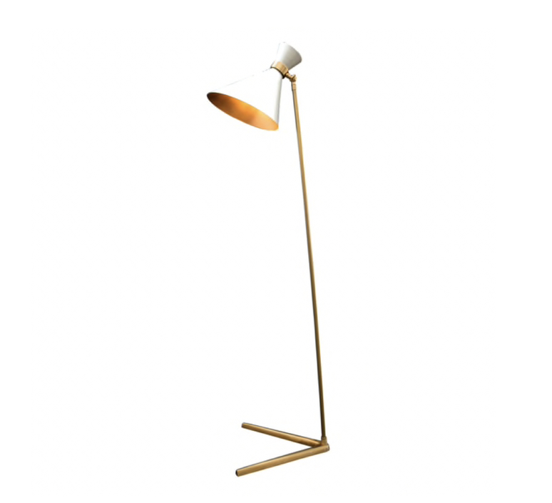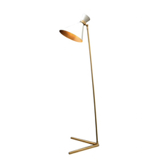 Le lampadaire blanc a une base en laiton avec une finition antique et un abat-jour mat qui s'harmonise avec la teinte dorée à l'intérieur. La cale réglable permet également de faire pivoter la lampe vers le haut et vers le bas en fonction de vos besoins, mais elle n'est pas destinée à être déplacée par la suite.
