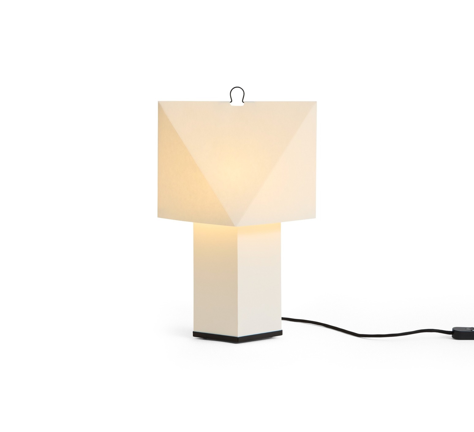 Principalement réalisée en papier plié, elle se distingue par une conception à plat à assembler soi-même, où des lignes précises et des angles nets donnent naissance à un volume graphique d’une grande simplicité. Sa surface diffuse en papier laisse filtrer une lumière douce et chaleureuse, qui évoque la lueur apaisante d’une bougie, et crée une atmosphère intime. Sa construction minimaliste, complétée par un discret crochet en métal, en fait un luminaire facile à déplacer au gré des besoins.