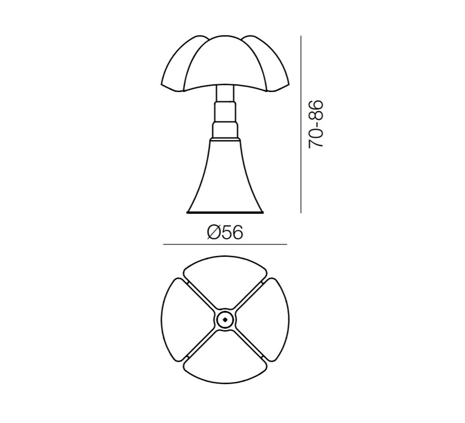 Le diffuseur de la lampe propage une lumière douce et intense grâce à un module LED 2700K, 1400lm. La Pipistrello est composée d'un diffuseur en méthacrylate opale blanc et d'une base télescopique en inox. Elle mesure jusqu'à 86 cm de hauteur pour un diamètre de 55 cm. L'intensité est variable grâce au dimmer positionné sur le câble.