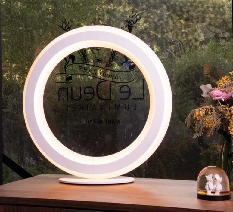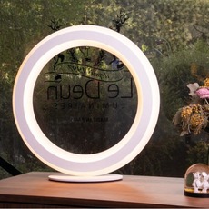 La lampe à poser Zepto fonctionne avec une source LED intégrée alimentée par un transformateur électronique et muni d’un variateur pour ajuster l’intensité lumineuse selon l’atmosphère souhaitée. Elle mesure 50 cm de diamètre et diffuse une lumière chaude de 2700K. Son câble mesure 2m de longueur.
