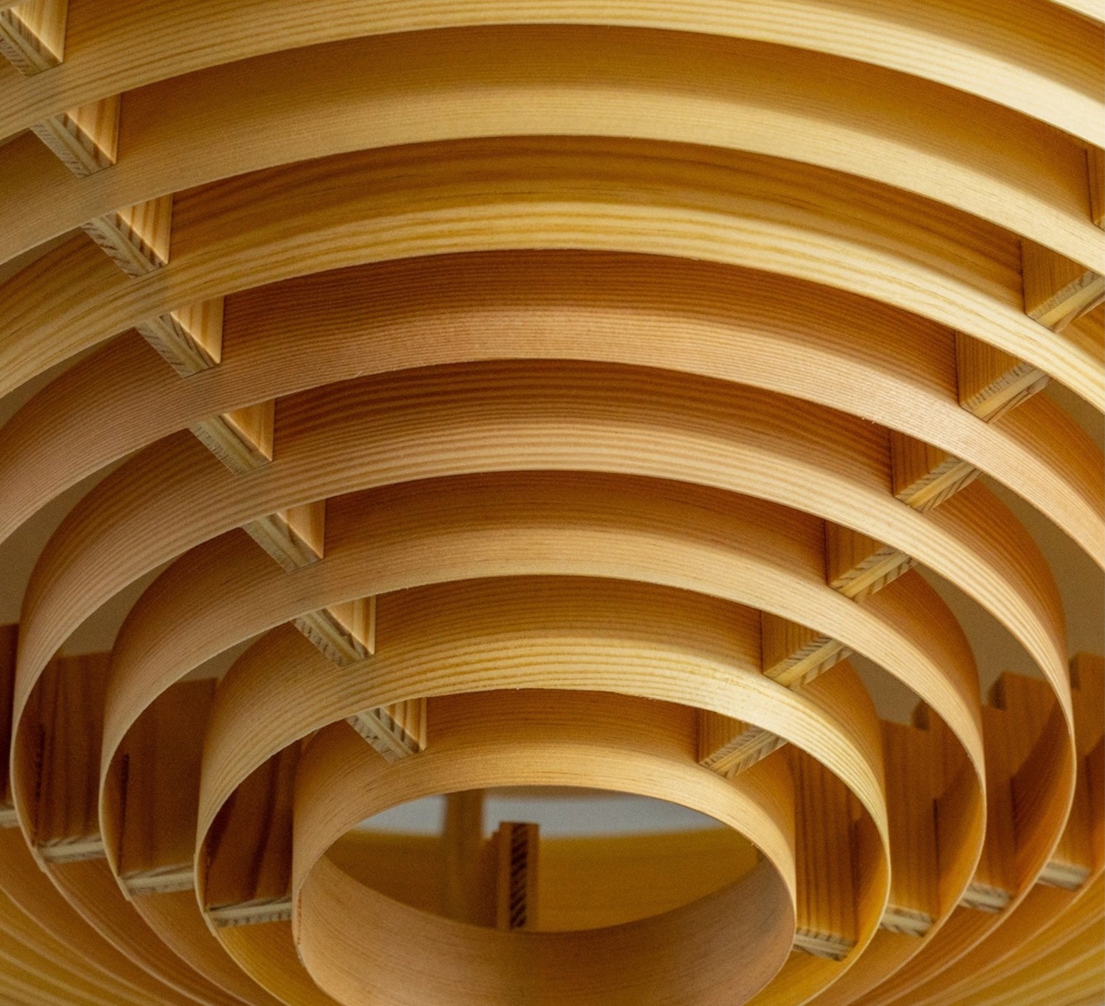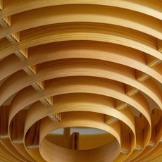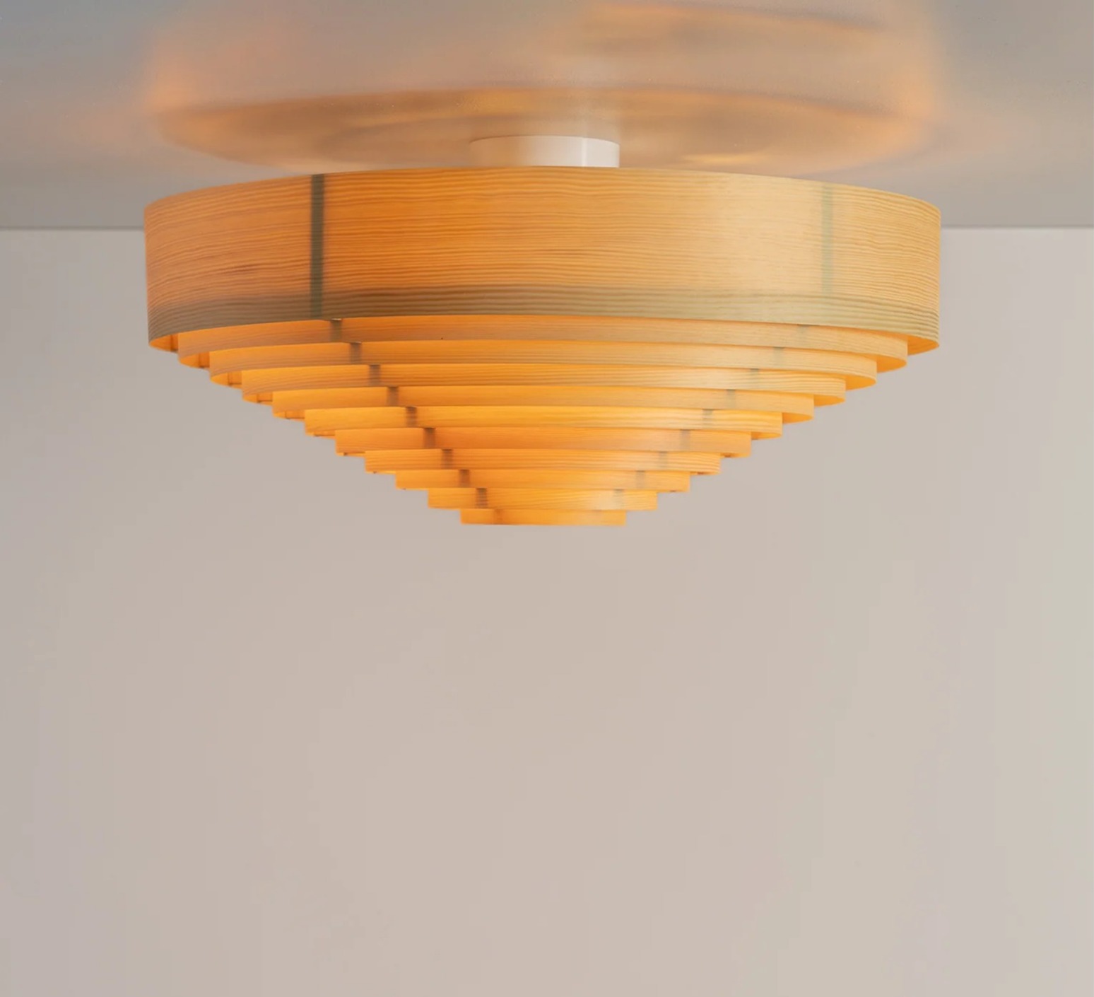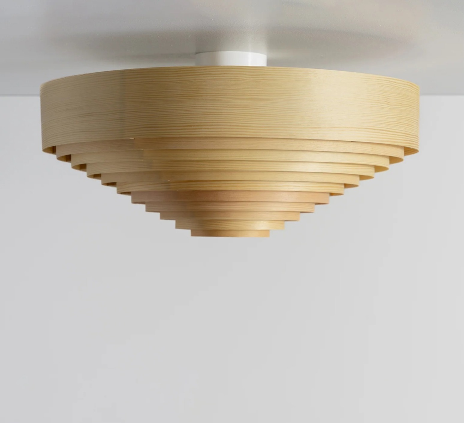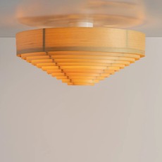 Cette pièce revisite un classique des années 1960 en remplaçant la construction d’origine par du pin finlandais huilé‑ciré, conférant au luminaire une allure graphique et chaleureuse. Sa forme conique en bois aux cercles concentriques laisse filtrer une lumière douce et dorée à travers les lamelles, comme une lumière naturelle tamisée qui habille subtilement l’espace de vie.
