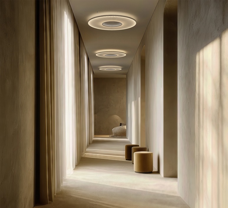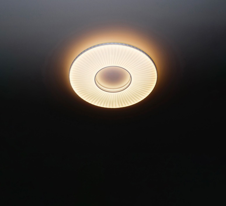 Iris est un véritable soleil d’intérieur. Sa lumière, à la fois puissante, douce et diffuse, évoque celle d’un astre. Composé d’un abat-jour en ruban blanc et d’une structure discrète, il semble flotter au plafond pour illuminer l’espace avec légèreté et élégance.