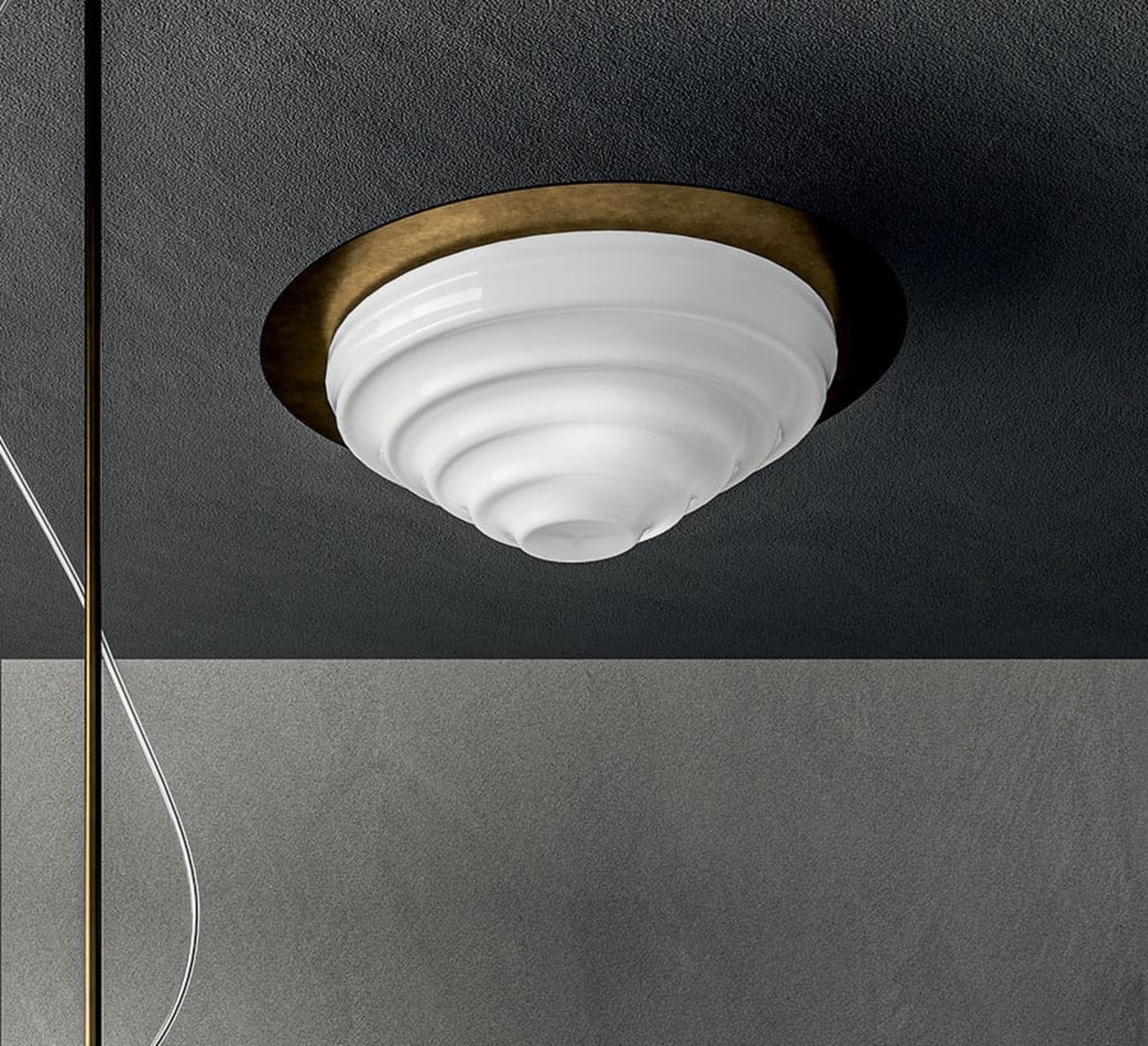 Sa teinte brune raffinée en association avec le verre blanc brillant crée un contraste visuel frappant, accentuant ainsi son esthétique moderne et sophistiquée. Les ondulations concentriques en verre de Murano évoquent gracieusement les mouvements en surface de l'eau, jouant avec la lumière pour une diffusion douce et uniforme.