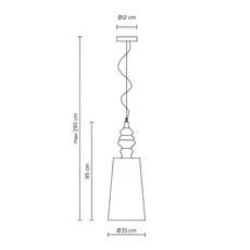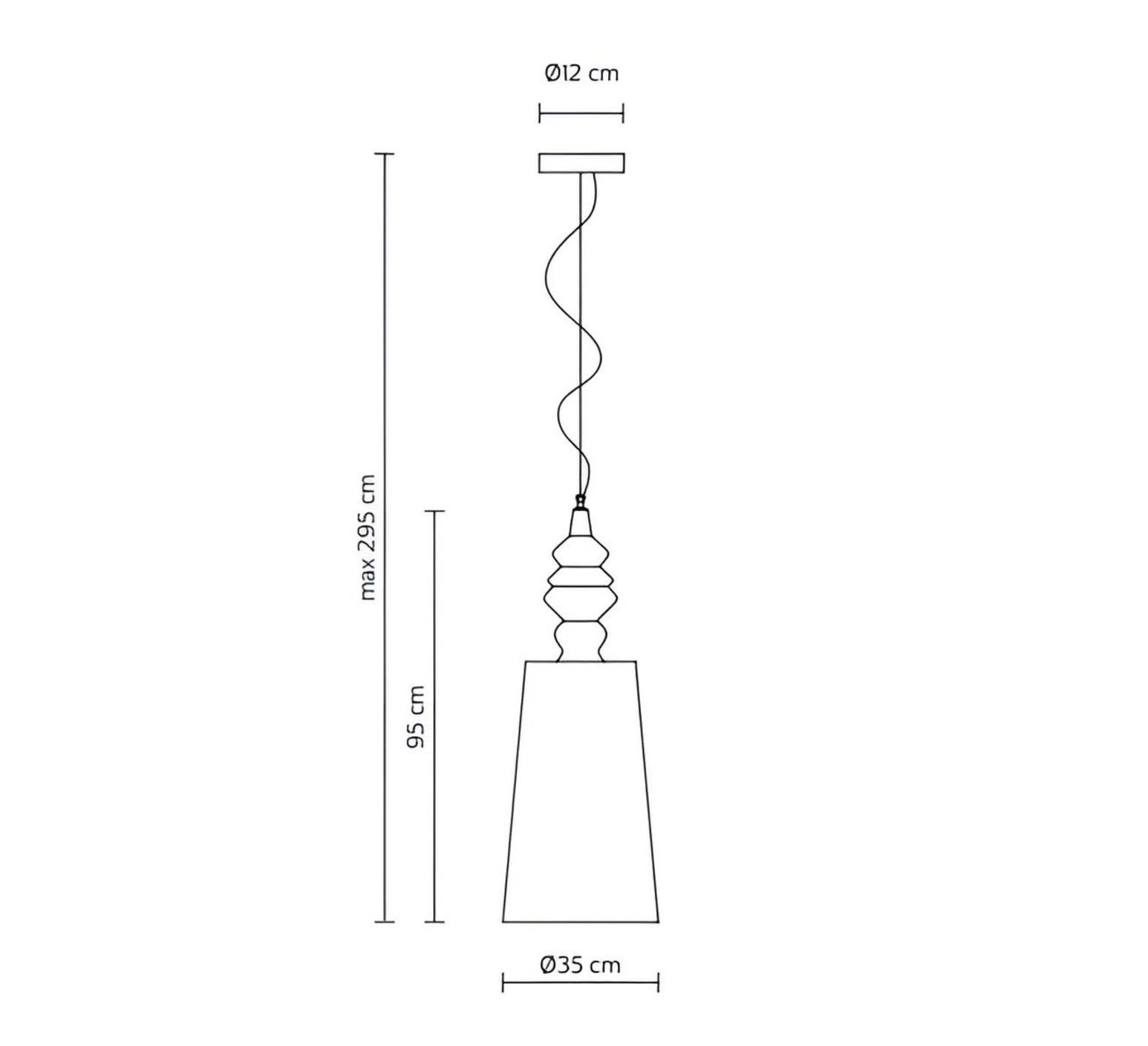 La suspension mesure environ 35 cm de diamètre et 95 cm de hauteur, avec un câble de suspension réglable d’environ 2 m pour ajuster la hauteur sous plafond selon ton espace. Sa source lumineuse (1 x E27) n'est pas incluse mais disponible dans les accessoires indispensables.