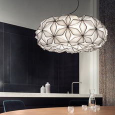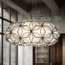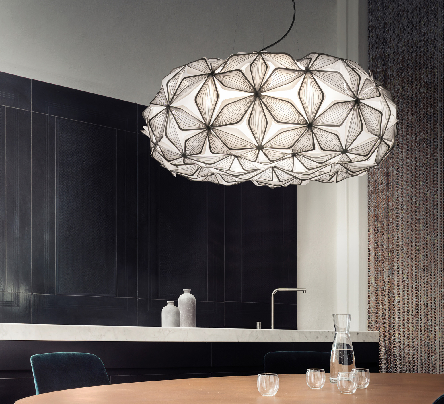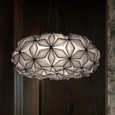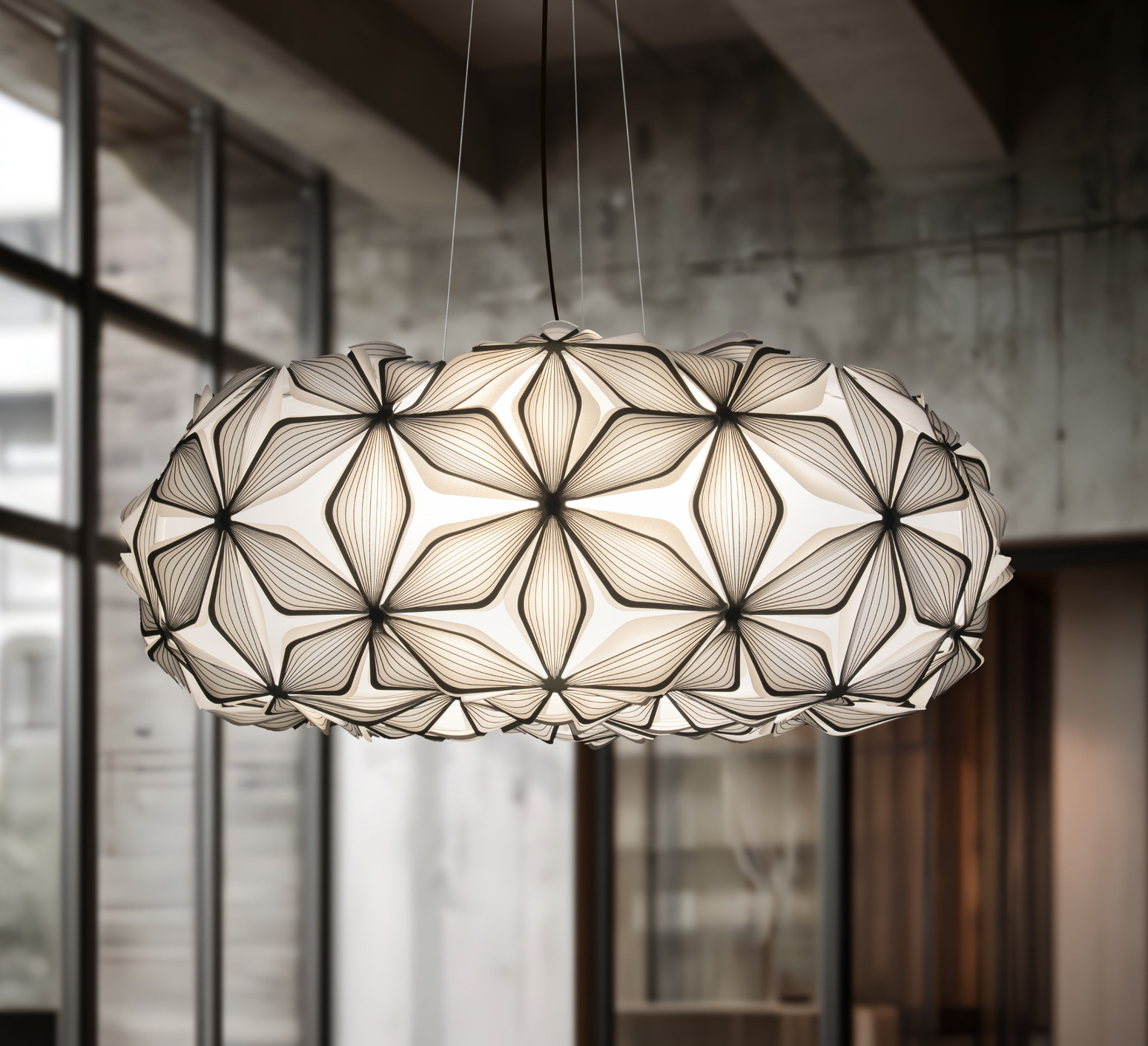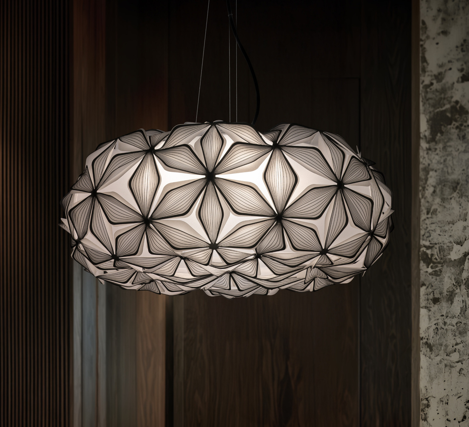 Sa silhouette sphérique de Ø 70 cm x H 28 cm, associée au noir profond et au câble noir de 1,4 m, crée un volume visuel structurant tout en restant aérien. Les pétales sérigraphiés déploient un jeu de textures qui capte la lumière et transforme l’espace. Installée au-dessus d’une table, dans un salon, un hall ou un environnement professionnel, elle devient un point focal clair et équilibré, parfaitement adaptée aux intérieurs contemporains et épurés.