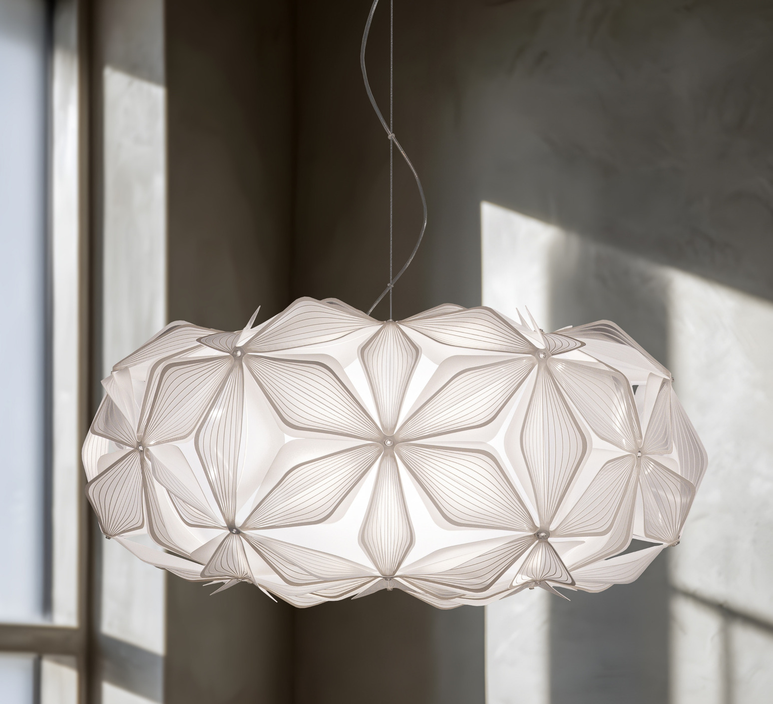 Sa silhouette sphérique de Ø 53 cm x H 26 cm, associée au blanc profond et au câble transparent de 1,4 m, crée un volume visuel structurant tout en restant aérien. Les pétales sérigraphiés déploient un jeu de textures qui capte la lumière et transforme l’espace. Installée au-dessus d’une table, dans un salon, un hall ou un environnement professionnel, elle devient un point focal clair et équilibré, parfaitement adaptée aux intérieurs contemporains et épurés.