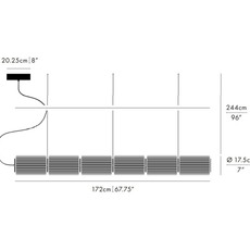 La suspension Column 175 composée de 6 cylindres mesure 172cm de longueur, 17,5cm de longueur et 17,5cm de profondeur. Le module Led intégré a une puissance de 72W et diffuse 2700K. Possède un IRC de 90 promettant un rendu réaliste des couleurs. Rosace et câbles ajustables inclus. Dimmable DALI.