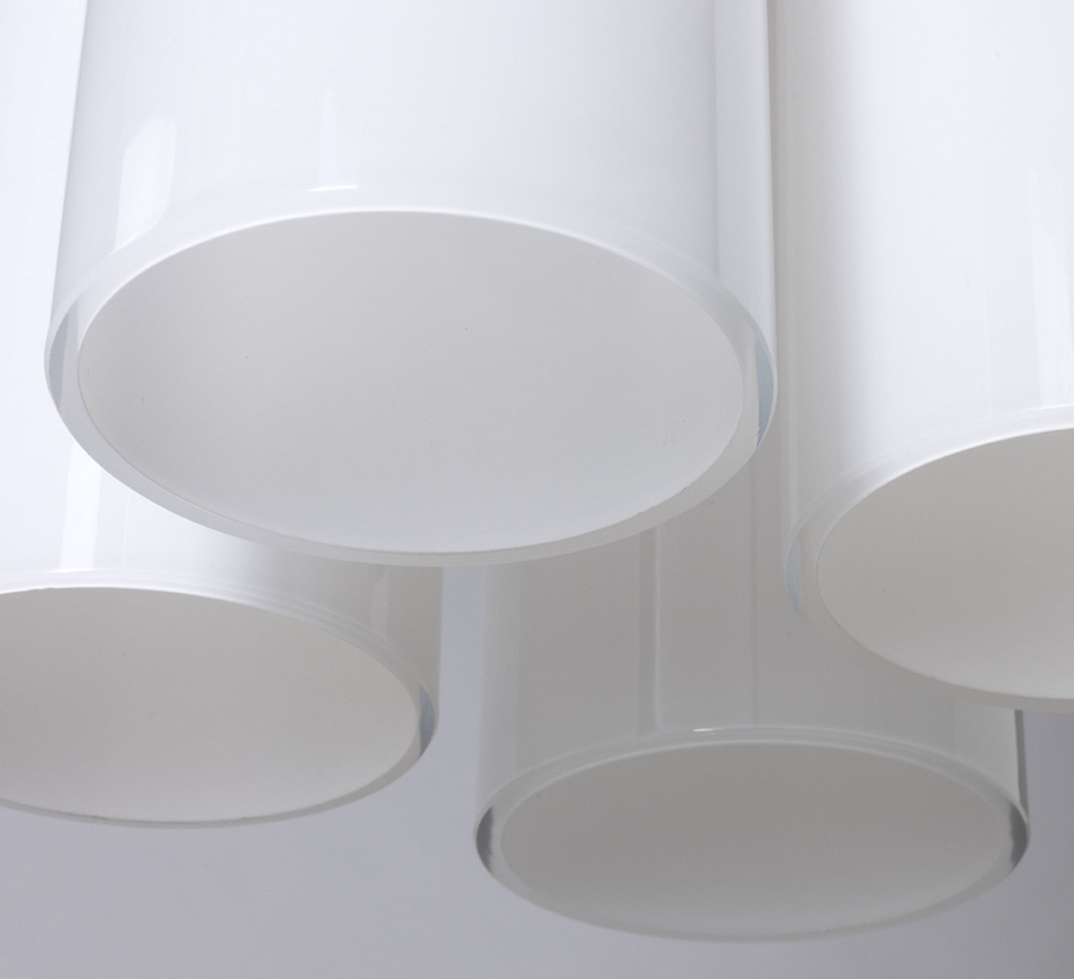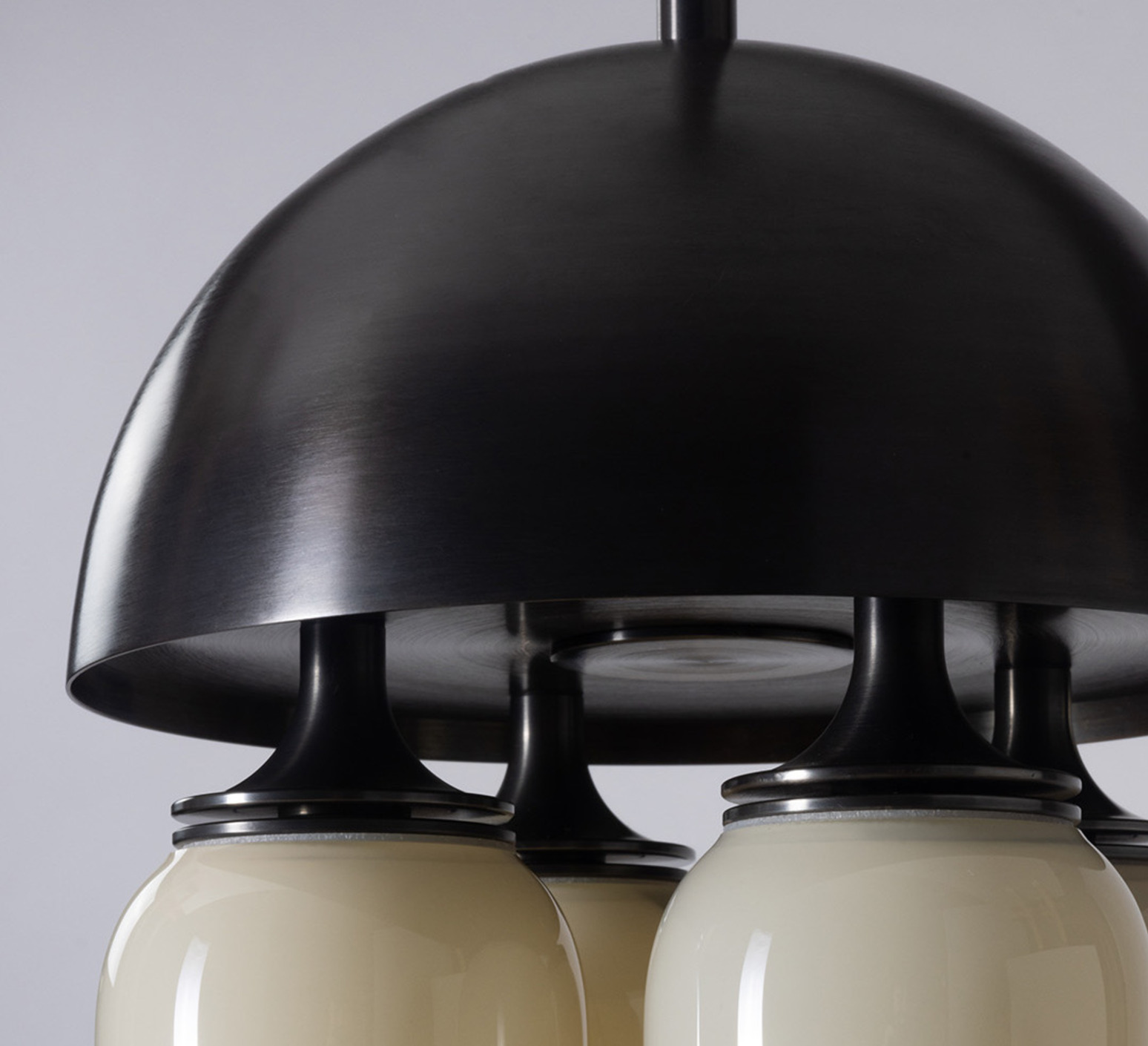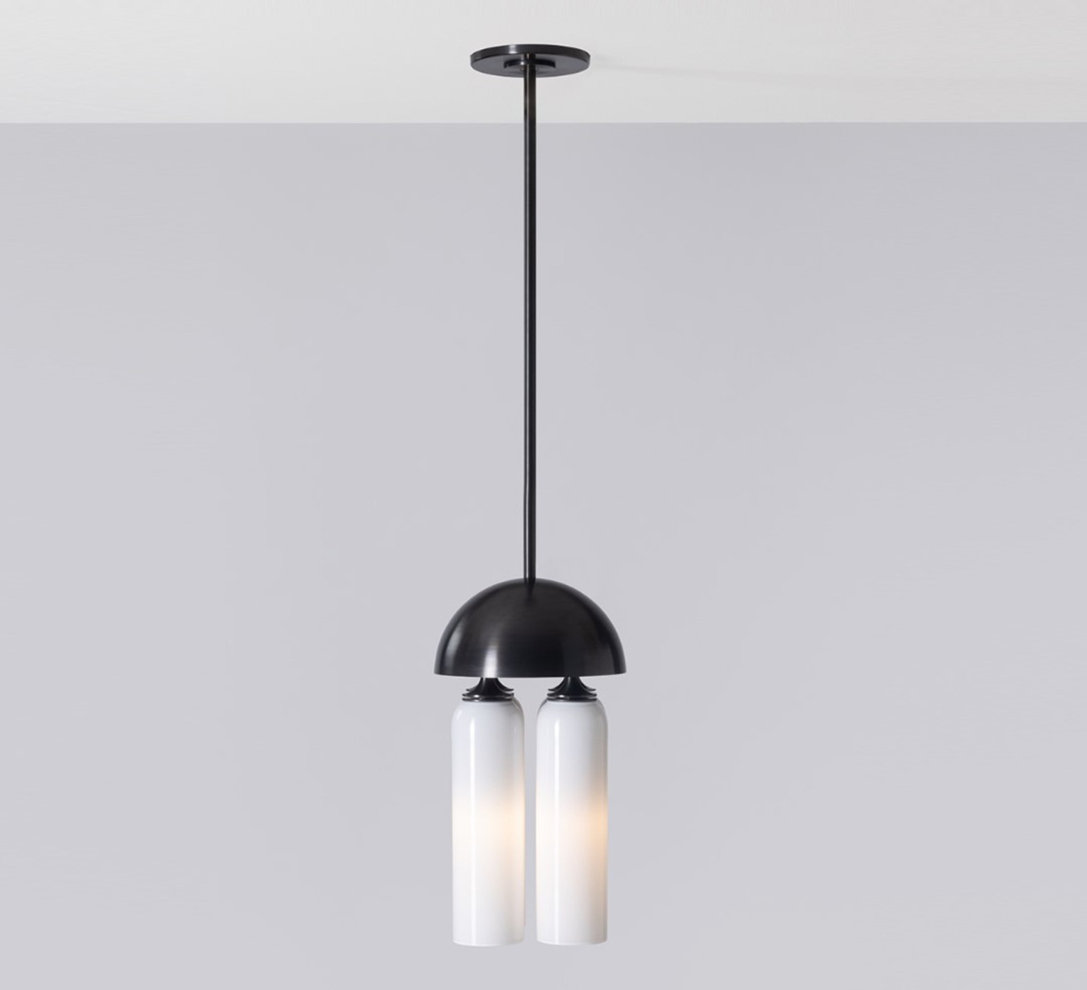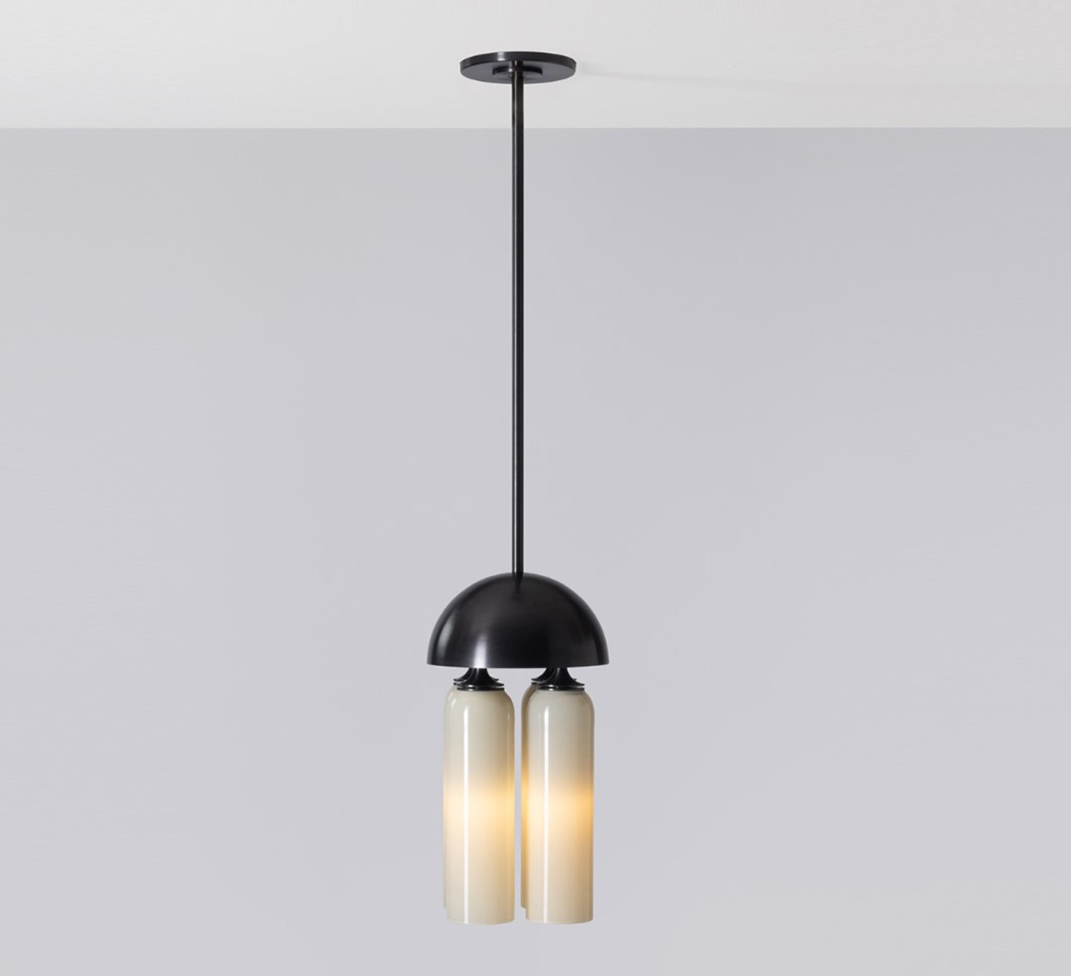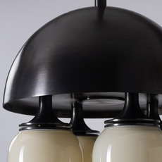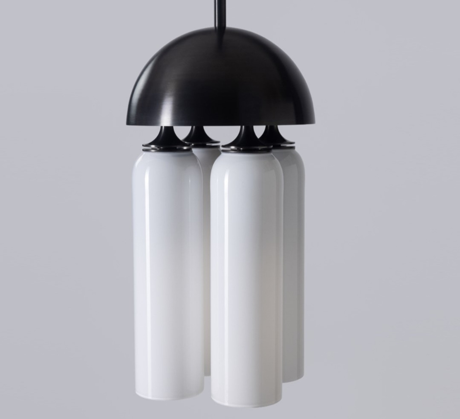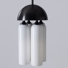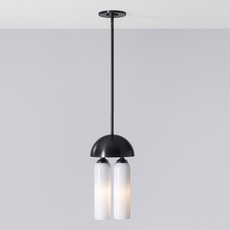 Son esthétique repose sur un jeu de volumes cylindriques en verre soufflé blanc, subtilement contrastés par une structure en laiton à finition noir oxydé. Les formes lumineuses se nichent sous un dôme métallique, créant une composition graphique et équilibrée. Cette suspension trouve naturellement sa place au-dessus d’une table, dans un salon ou un espace d’accueil, où elle apporte une présence sculpturale tout en diffusant une lumière élégante et enveloppante.