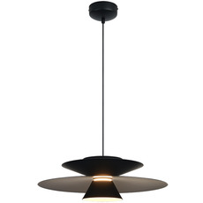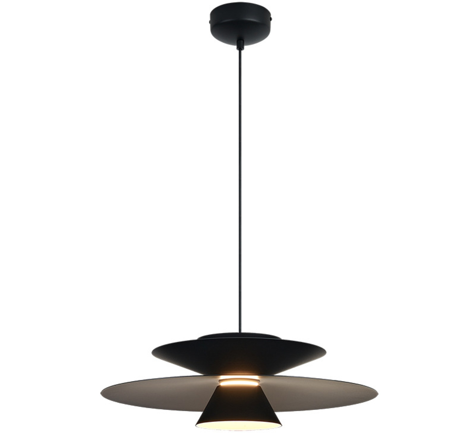 Son design circulaire noir en aluminium joue sur des volumes imbriqués qui captent et diffusent la lumière avec subtilité. Le diamètre de 50 cm et la hauteur compacte de 15,4 cm conviennent aux plafonds standards comme aux espaces généreux. Suspendue au-dessus d'une table de repas, d'un îlot de cuisine ou d'un salon, elle crée un point focal épuré. Son câble blanc de 2 mètres s'intègre discrètement au décor.