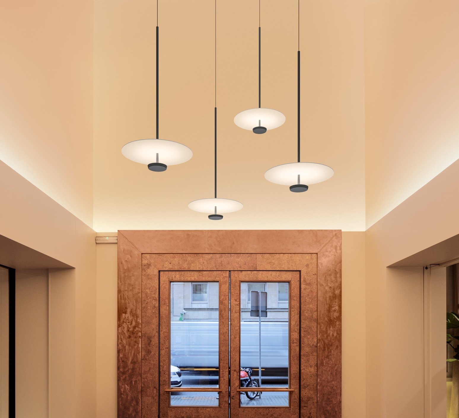 Celle-ci allie en un seul objet le meuble et le luminaire. Un plateau lumineux descend du plafond jusqu’à former une suspension faite d’un disque de lumière réfléchie qui s’intègre élégamment à l’architecture. La lampe Flat diffuse une lumière douce grâce à son diffuseur en polycarbonate pour une ambiance très reposante, idéale pour un salon, bibliothèque ou salle d’attente par exemple.