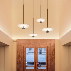 Suspendu au plafond par un câble, le luminaire, à la fois graphique, léger et délicat, semble flotter dans l’air. Également disponible en gris et rouge.