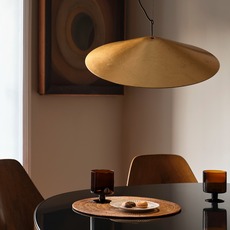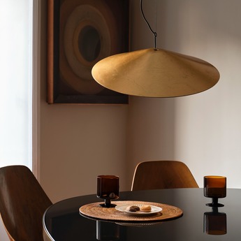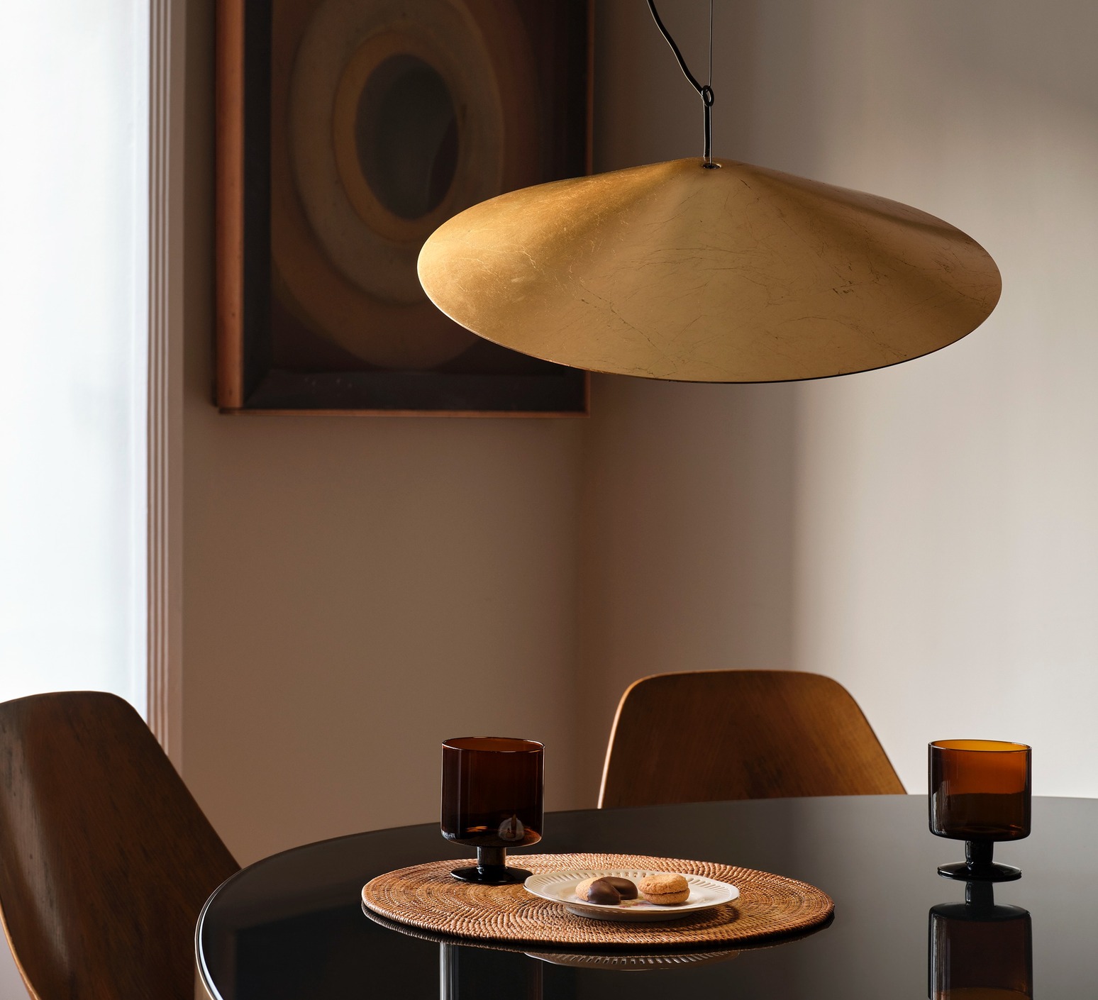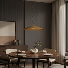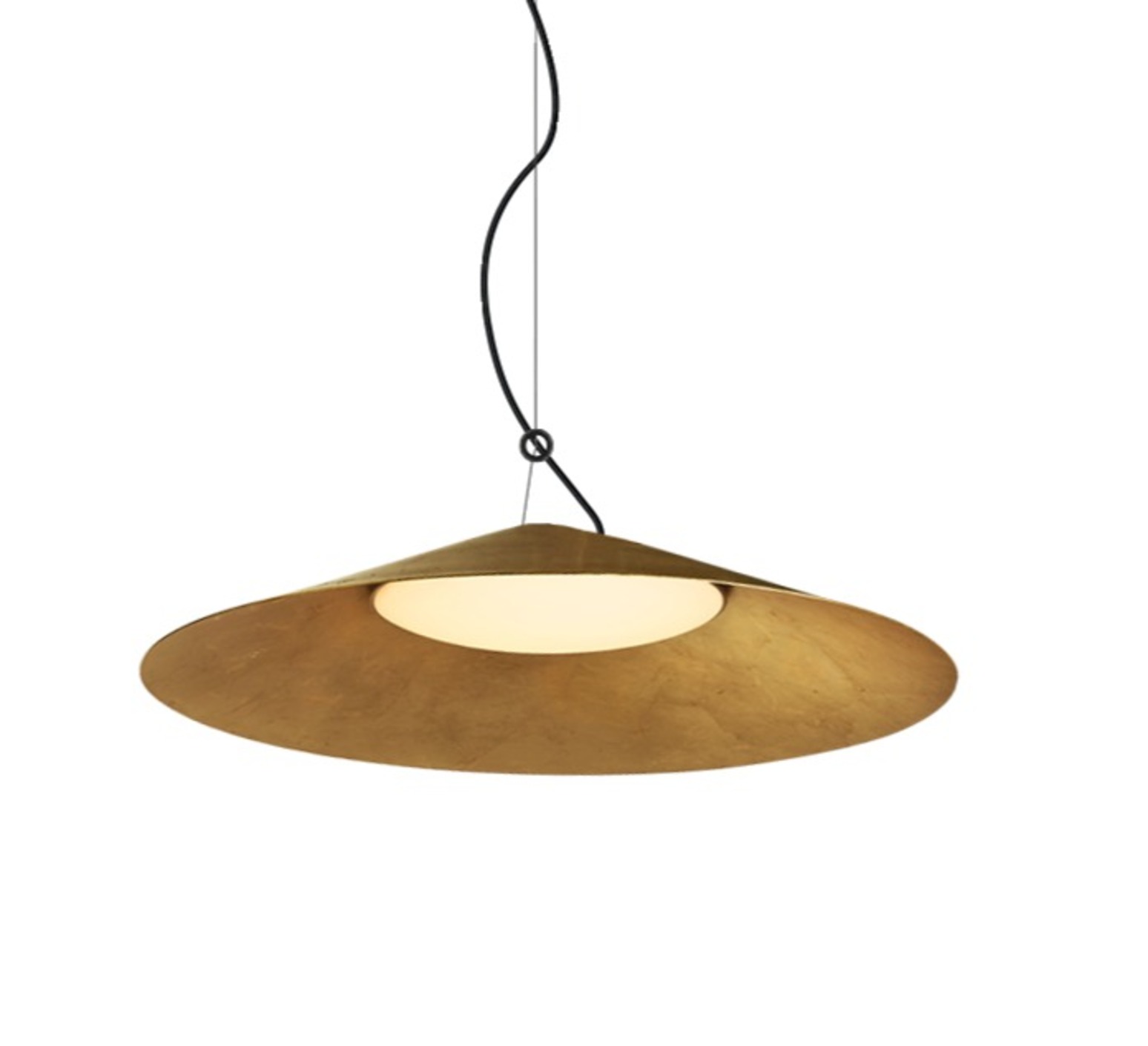 Kate 43 se distingue par son diffuseur pouvant être incliné, maintenu en suspension par un câble tendu ponctué d’un anneau qui libère l’orientation de la lumière. Sa forme conique fine, ici en finition feuilles d’or, apporte une présence graphique maîtrisée et élégante sans alourdir l’espace. Installée seule au-dessus d’une table ou en composition dans un séjour ou un espace professionnel, elle structure le volume tout en offrant une lumière directe et diffuse, idéale pour accompagner les usages quotidiens avec justesse.