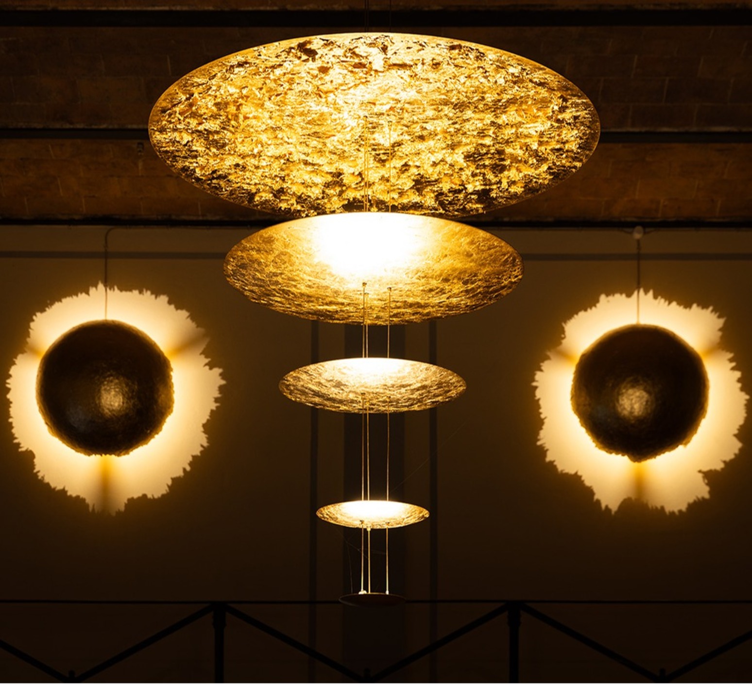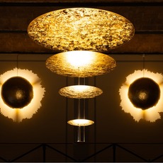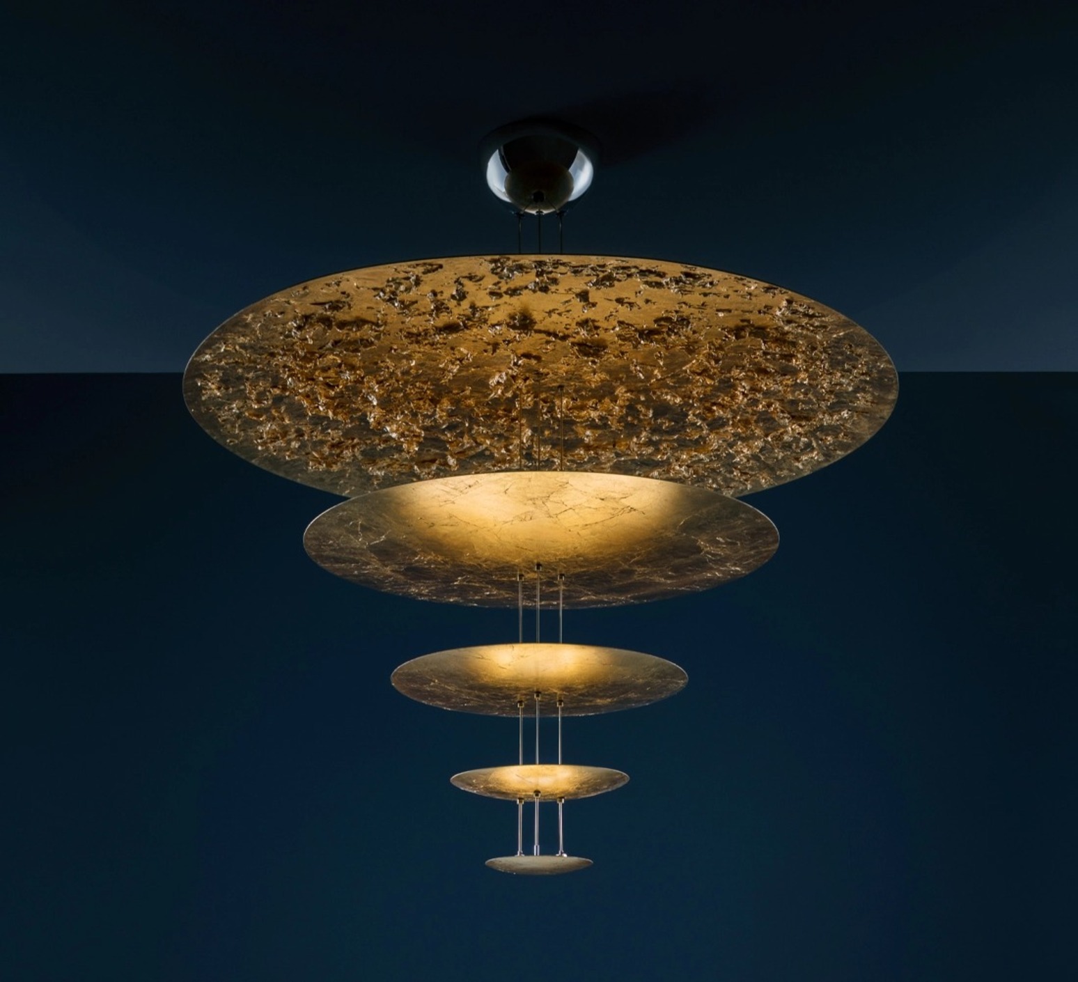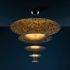 Composée de plusieurs disques métalliques superposés et traités à la feuille métallisée, cette lampe suspendue joue avec la lumière et les surfaces pour créer une atmosphère chaleureuse et vibrante, évoquant une constellation lumineuse ou une sculpture solaire qui rayonne dans l’espace.