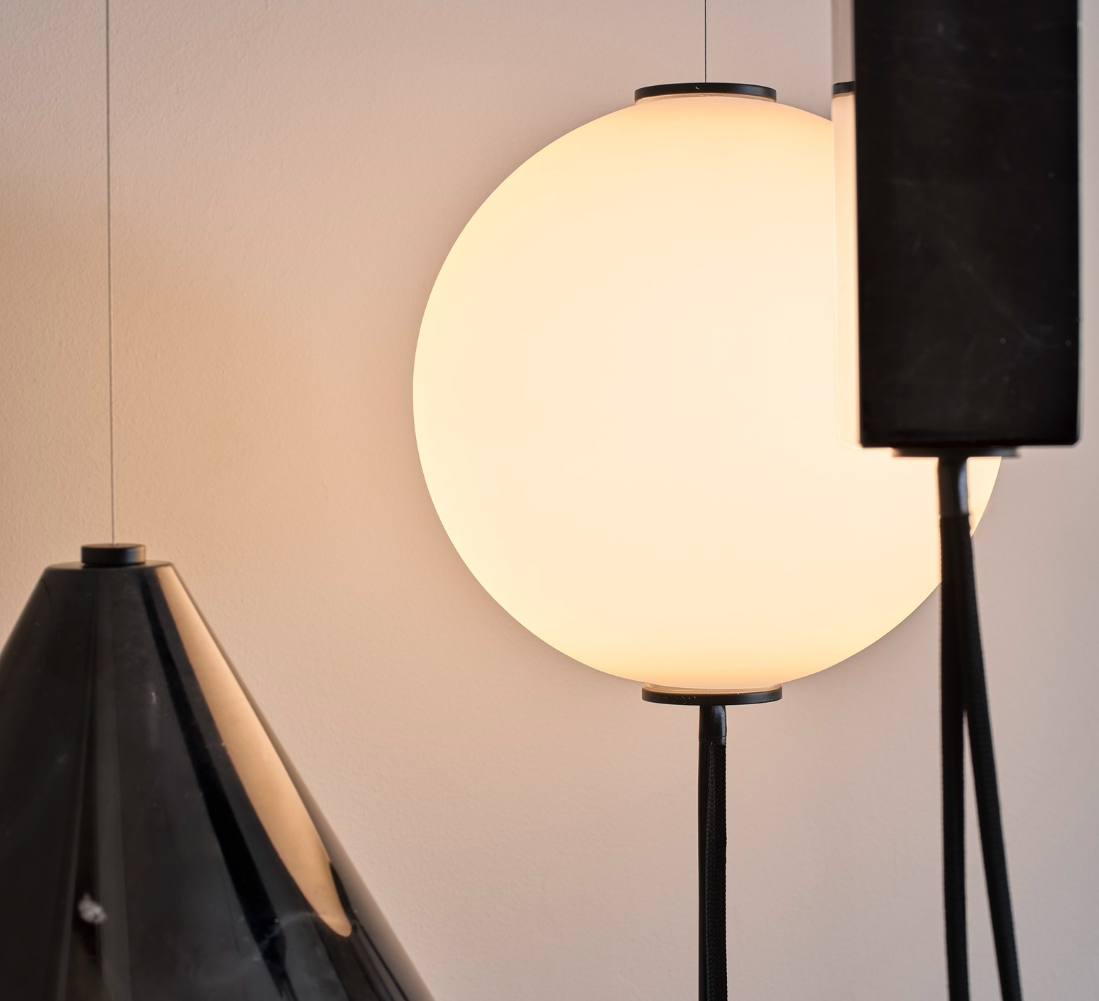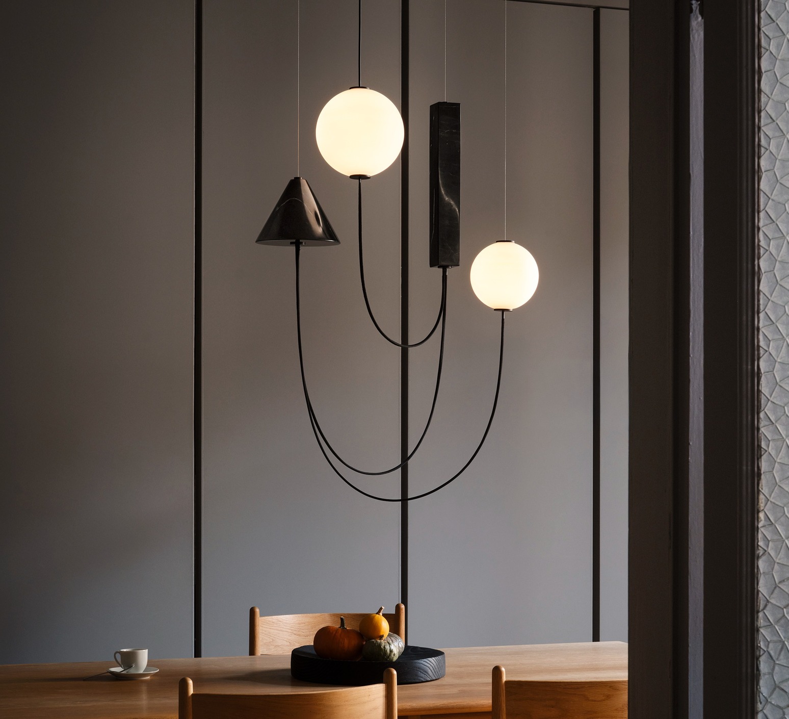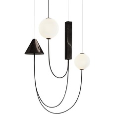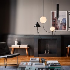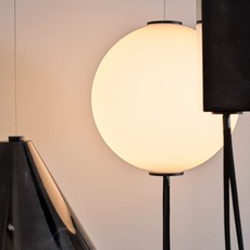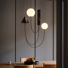 La suspension Mars développe une écriture graphique où la lumière devient le point d’origine de la forme. Deux diffuseurs sphériques en verre opalin soufflé semblent entrer en orbite, accompagnés de volumes en marbre noir qui tracent des géométries dans l’espace. Chaque élément trouve sa place dans un équilibre maîtrisé entre gravité et légèreté. Installée au-dessus d’une table de repas ou dans un séjour, elle structure l’espace tout en diffusant une ambiance chaleureuse et lisible, sans dominer l’architecture environnante.