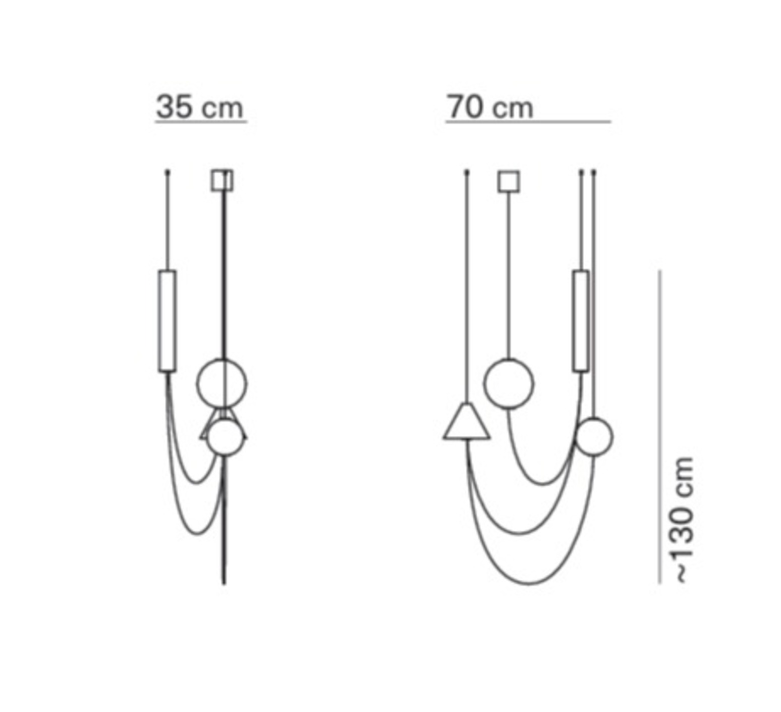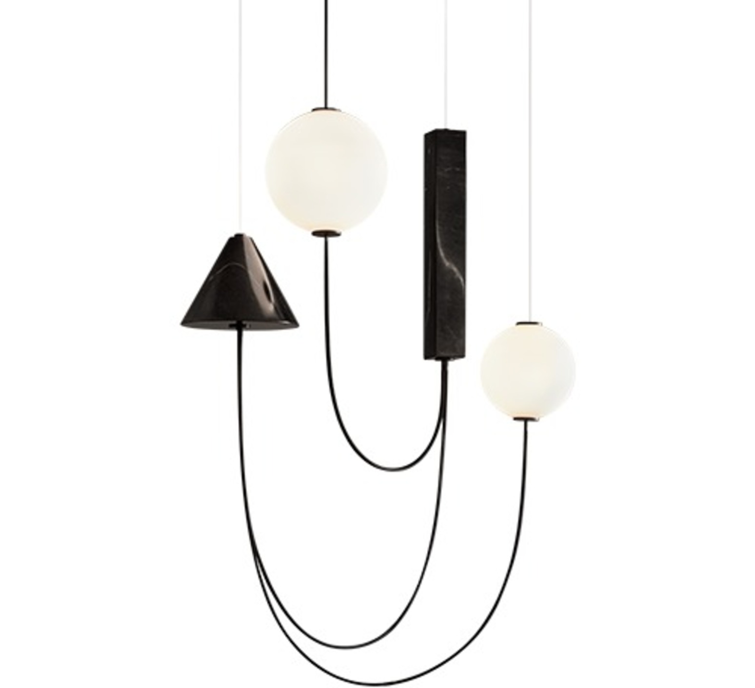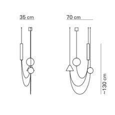 La suspension mesure 70 cm de longueur pour 130 cm de hauteur et dispose d’un câble acier de 1,8 m. Elle intègre un module LED de 26,3 W délivrant 3000 lm en 2700 K, avec un éclairage diffus à 360° et un excellent rendu des couleurs (CRI >90). La variation possible en coupure de phase permet d’ajuster l’intensité lumineuse selon l’usage. La structure est en métal peint, les formes en marbre noir, les diffuseurs en verre opalin, pour un ensemble fixe.