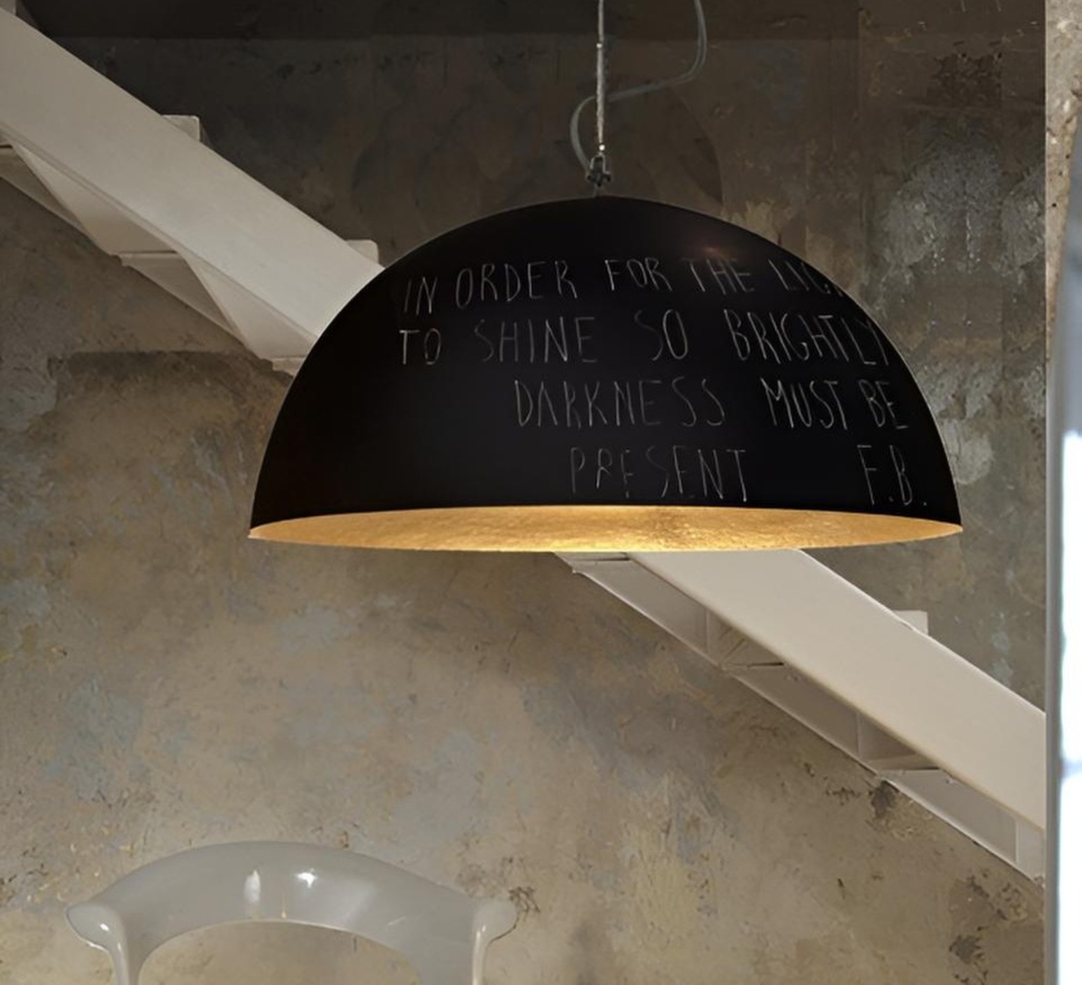 Composée de résine effet tableau noir associé à la matière nébulite innovante, cette suspension évoque une surface sur laquelle on peut écrire, dessiner ou laisser des messages à la craie comme sur un véritable tableau, en transformant l’éclairage en une surface d’expression artistique.