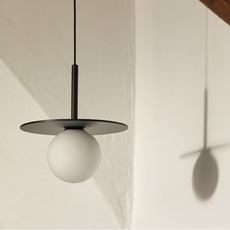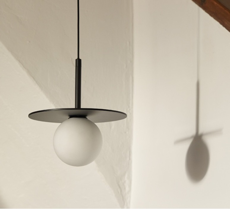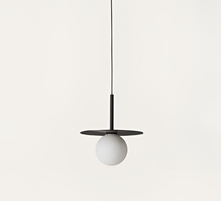 La suspension Miro, dessinée par AC Studio pour Aromas del Campo, combine une structure en acier finition noir mat et un abat-jour en verre opalin soufflé.
