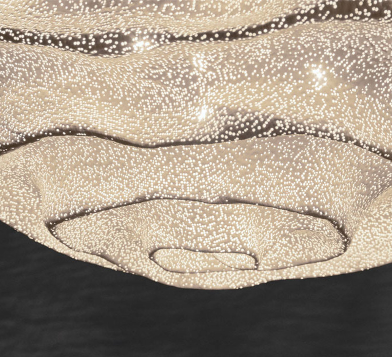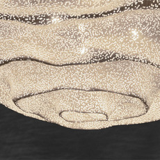 Nevo met en valeur la malléabilité du treillis d'acier peint en blanc, façonné à la main pour former des volumes libres et évolutifs. Ses courbes irrégulières et ses plis structurent une enveloppe ajourée à travers laquelle la lumière se diffuse de manière homogène.