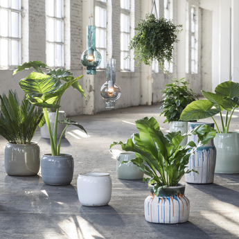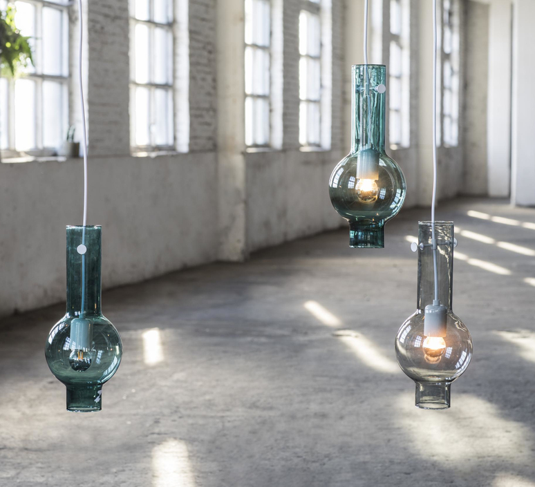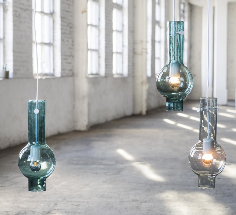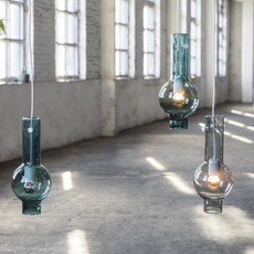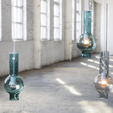 Les lampes Novecento sont réalisées en verre transparent, bleu ou gris clair. Les verres colorés permettent ainsi de diffuser une douce lumière d’ambiance. Le verre laisse transparaitre subtilement le système de suspension ainsi que la source lumineuse.