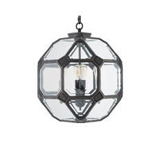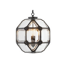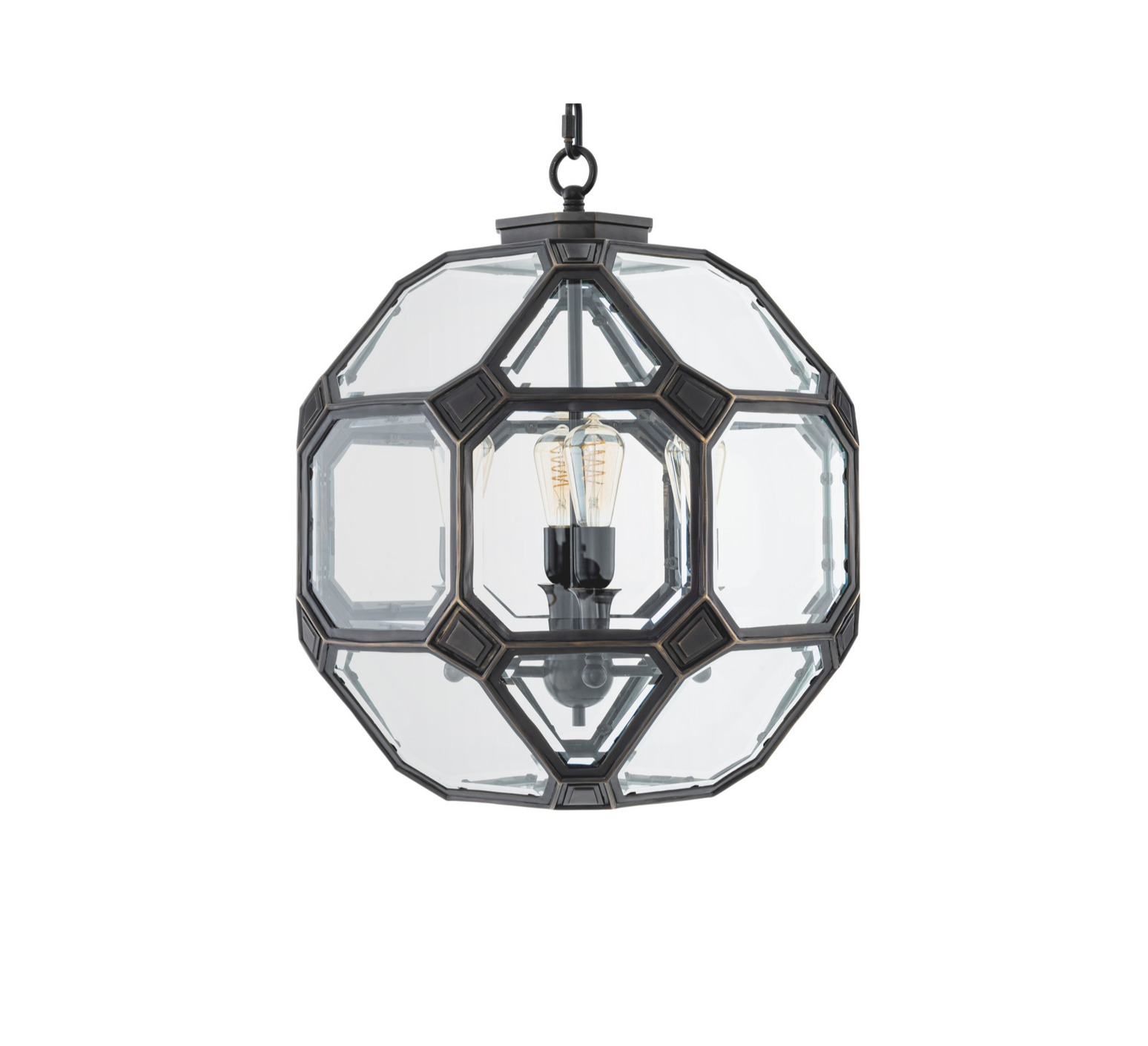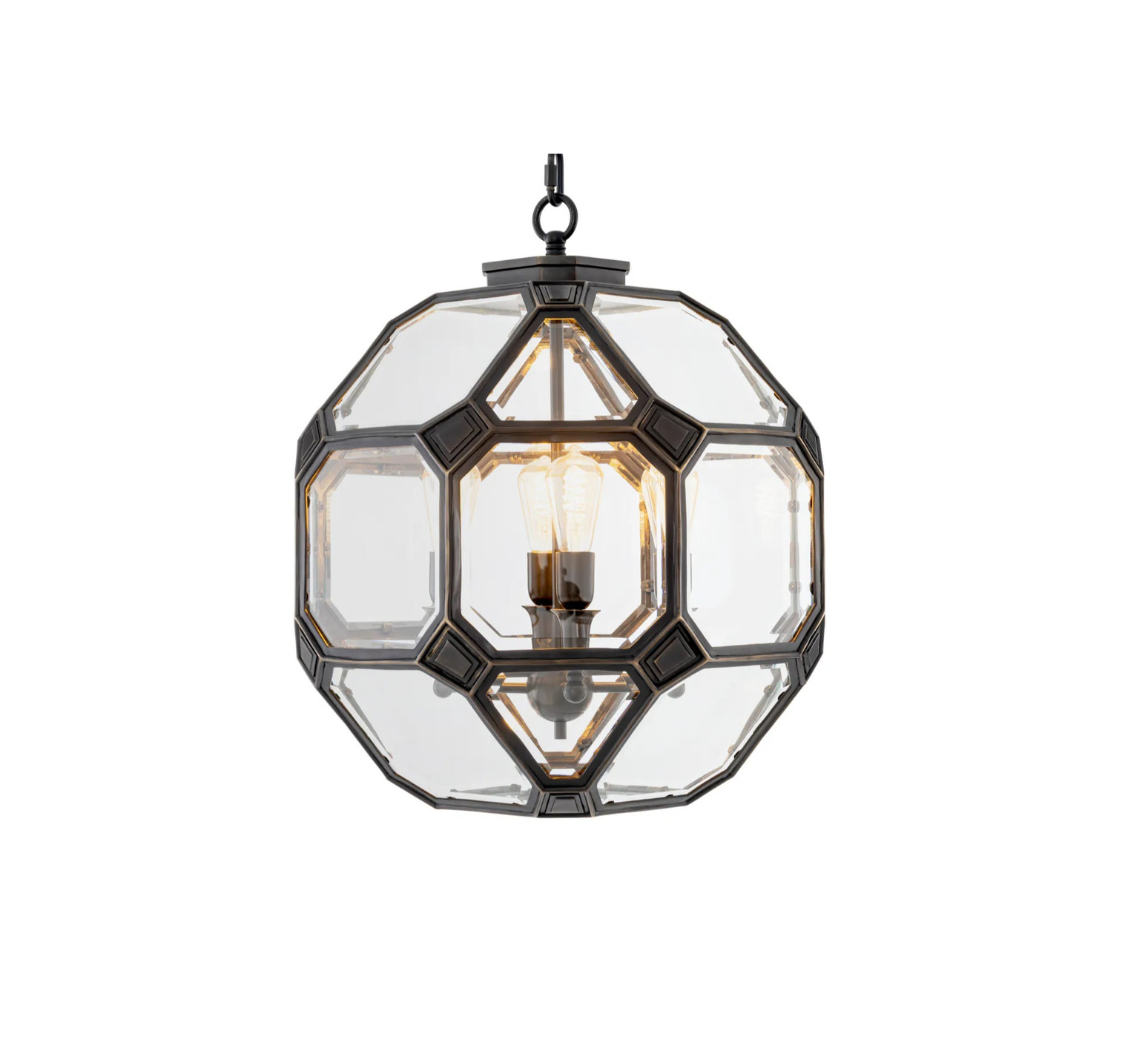Ce luminaire décoratif pour intérieur se distingue par sa forme sphérique et sa structure facettée en métal finition bronze, associée à des panneaux de verre transparent. Il se positionne comme un point focal architectural dans tout espace.