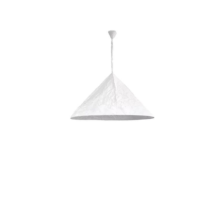 Elle repose sur une structure en métal qui définit sa forme conique et assure à la fois légèreté et stabilité. Sa surface diffuse la lumière tout en projetant un jeu complexe d’ombres qui transforme l’espace en une atmosphère poétique et graphique