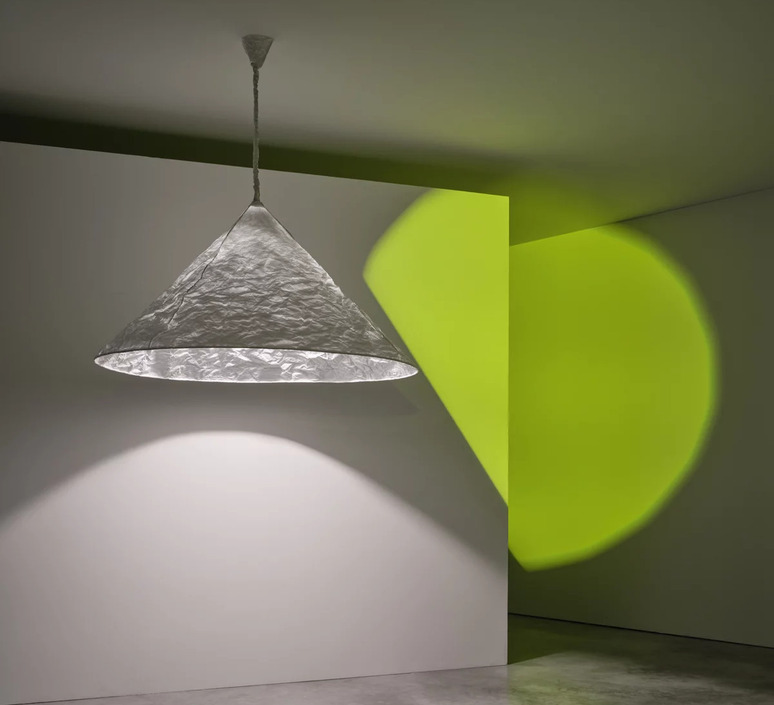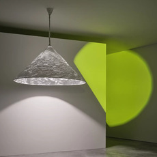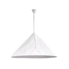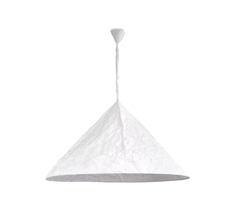 Elle repose sur une structure en métal qui définit sa forme conique et assure à la fois légèreté et stabilité. Sa surface diffuse la lumière tout en projetant un jeu complexe d’ombres qui transforme l’espace en une atmosphère poétique et graphique