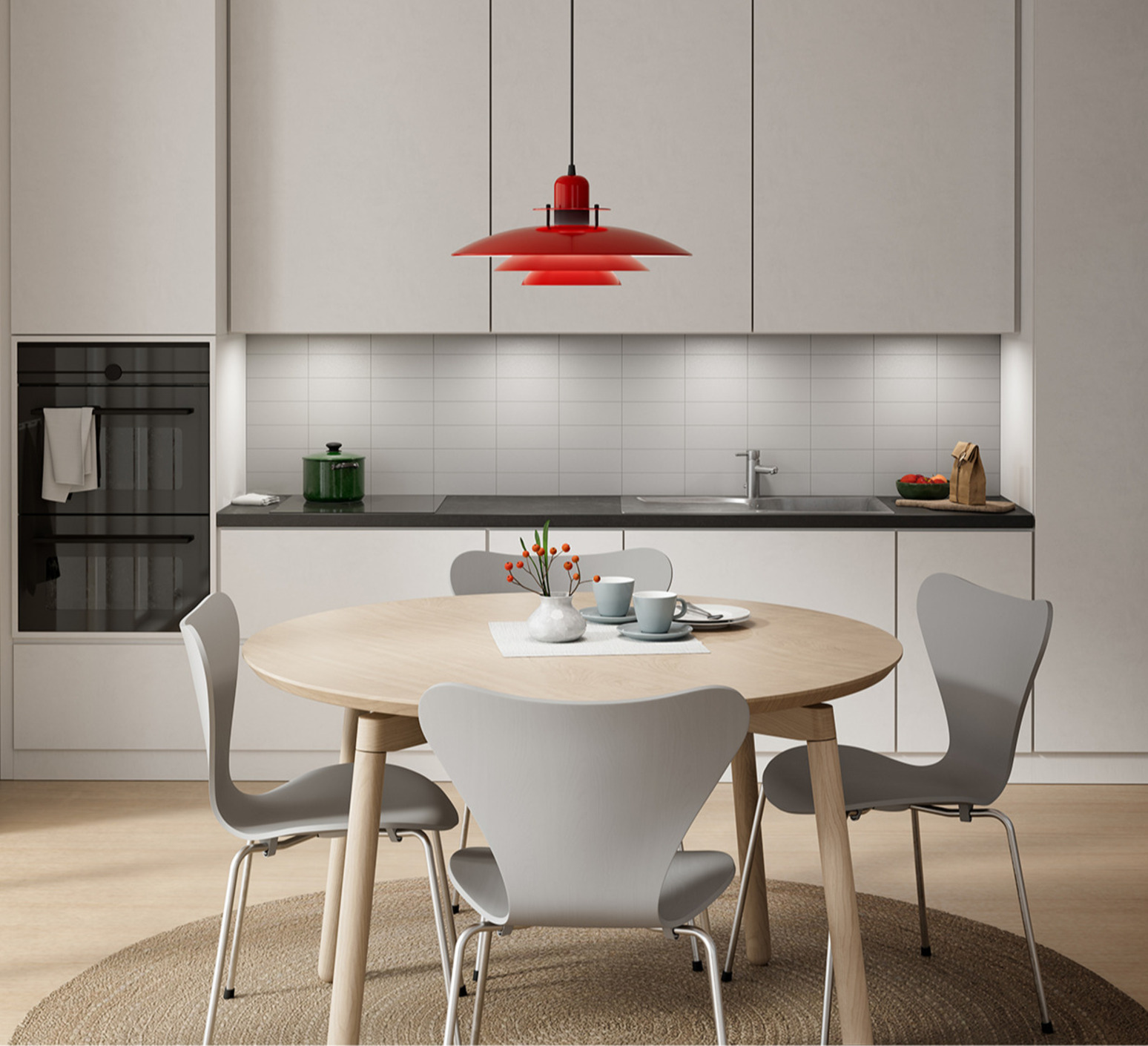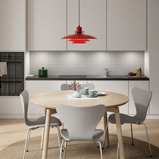 La Primus I offre une silhouette circulaire minimaliste, qui reflète l'élégance scandinave. Avec son diamètre de 43 cm et sa hauteur de 20 cm, elle apporte une lumière diffuse et agréable tout en restant discrète dans son environnement. Elle se marie facilement à d'autres suspensions de la collection pour créer une harmonie lumineuse dans une cuisine ou un espace café.