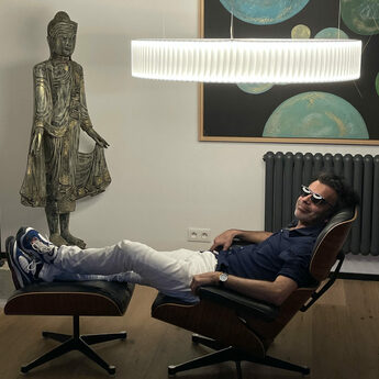 « Depuis longtemps je cherchais à développer une collection de luminaires interprétant de manière contemporaine le thème de l’abat jour. Pour la gamme RONDE, j’ai imaginé un abat jour évidé qui évoque la légèreté des ronds de fumée. Les suspensions RONDE sont à la fois décoratives et minimalistes. Leur géométrie simple habille l’espace. Leur finesse et leur sobriété incitent à réaliser des compositions aériennes avec les trois dimensions disponibles. »